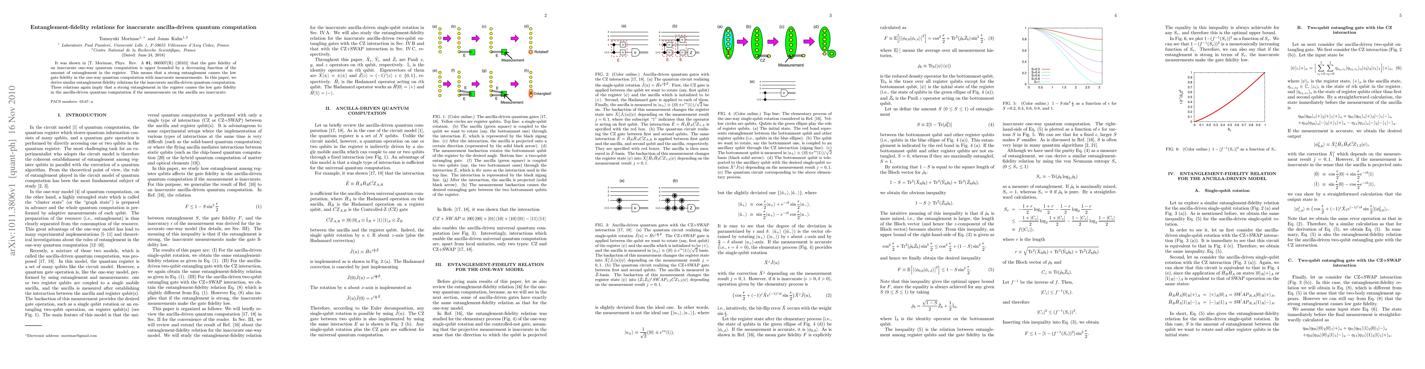This paper extends the entanglement-fidelity relations from one-way quantum computation to inaccurate ancilla-driven quantum computation, showing that strong entanglement in the register leads to lower gate fidelity when ancilla measurements are inaccurate.