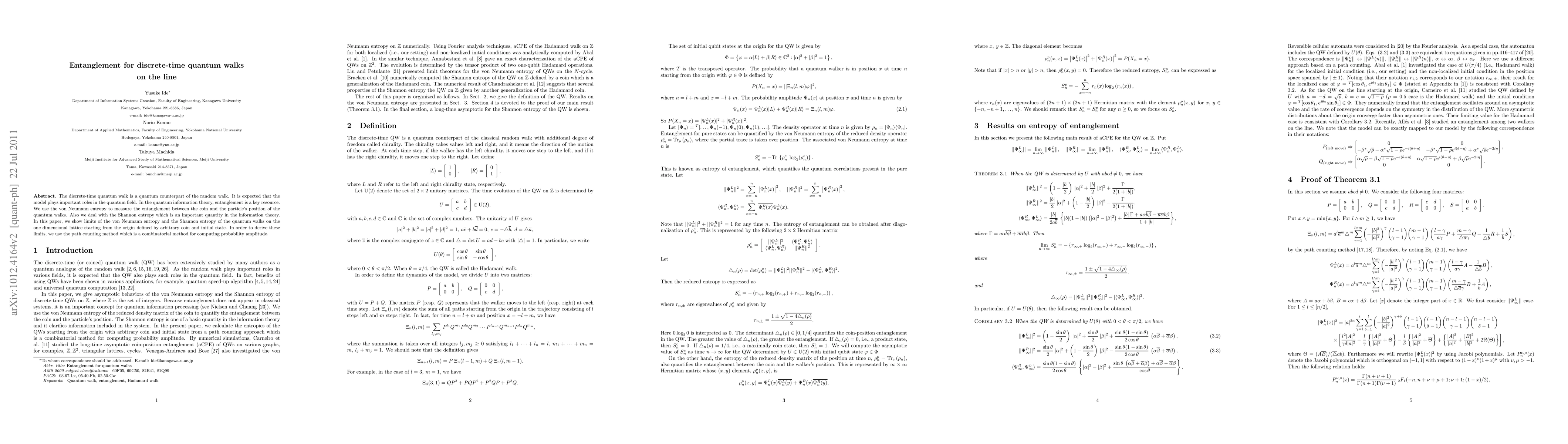 This paper explores entanglement in discrete-time quantum walks on a one-dimensional lattice, measuring it via von Neumann and Shannon entropies. It establishes limits for these entropic measures using a combinatorial path counting method.