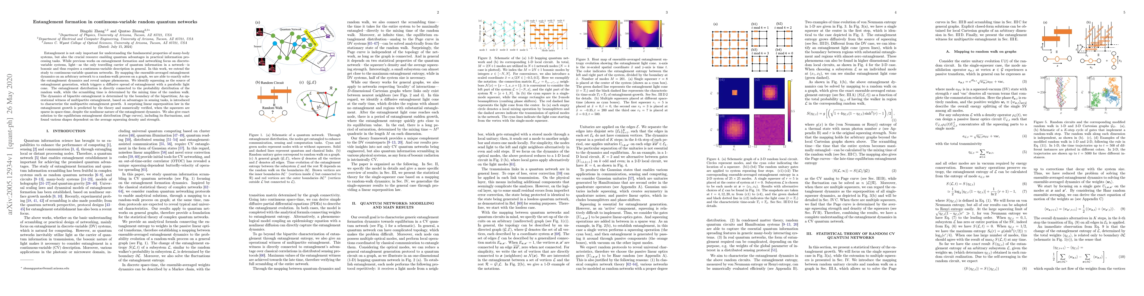 This paper explores entanglement formation in continuous-variable quantum networks, focusing on the dynamics and distribution of entanglement in bosonic systems. It reveals that squeezing generates entanglement, which spreads diffusively, and introduces a novel operational witness for multipartite entanglement. The study also predicts a linear superposition law for entanglement growth under sparse squeezers and provides exact solutions for equilibrium entanglement distribution.