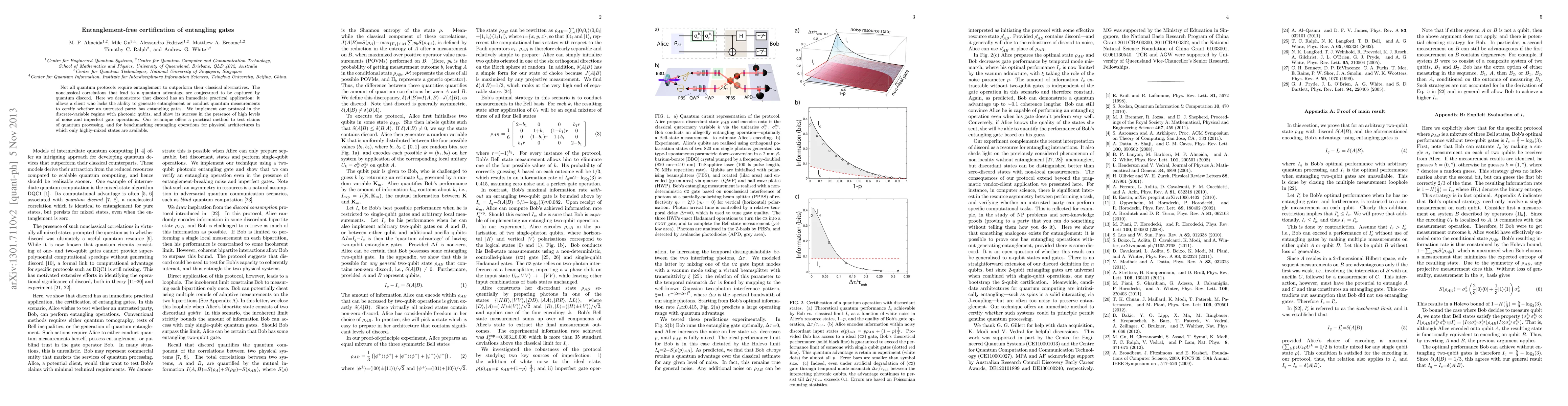 Not all quantum protocols require entanglement to outperform their classical alternatives. The nonclassical correlations that lead to this quantum advantage are conjectured to be captured by quantum discord. Here we demonstrate that discord can be explicitly used as a resource: certifying untrusted entangling gates without generating entanglement at any stage. We implement our protocol in the single-photon regime, and show its success in the presence of high levels of noise and imperfect gate operations. Our technique offers a practical method for benchmarking entangling gates in physical architectures in which only highly-mixed states are available.
