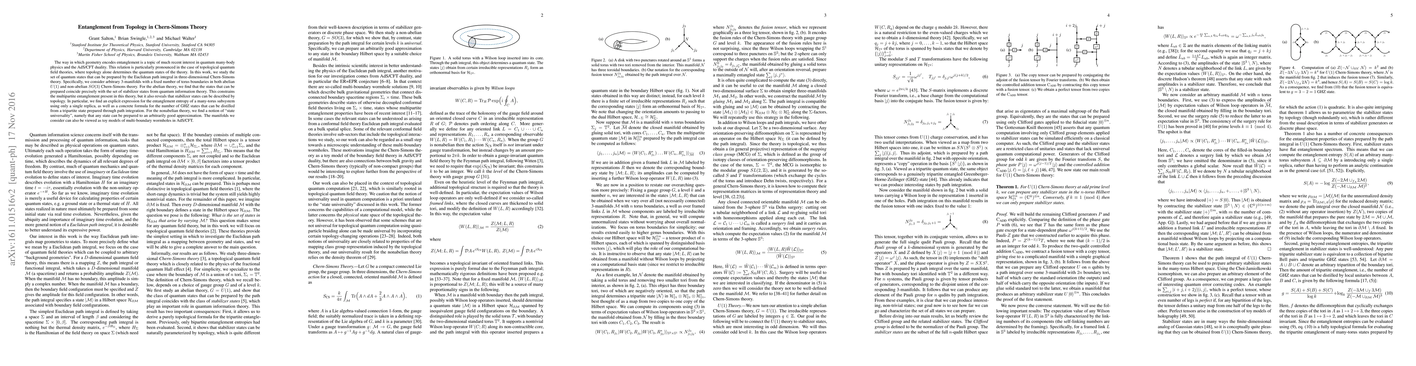 The way in which geometry encodes entanglement is a topic of much recent interest in quantum many-body physics and the AdS/CFT duality. This relation is particularly pronounced in the case of topological quantum field theories, where topology alone determines the quantum states of the theory. In this work, we study the set of quantum states that can be prepared by the Euclidean path integral in three-dimensional Chern-Simons theory. Specifically, we consider arbitrary 3-manifolds with a fixed number of torus boundaries in both abelian U(1) and non-abelian SO(3) Chern-Simons theory. For the abelian theory, we find that the states that can be prepared coincide precisely with the set of stabilizer states from quantum information theory. This constrains the multipartite entanglement present in this theory, but it also reveals that stabilizer states can be described by topology. In particular, we find an explicit expression for the entanglement entropy of a many-torus subsystem using only a single replica, as well as a concrete formula for the number of GHZ states that can be distilled from a tripartite state prepared through path integration. For the nonabelian theory, we find a notion of "state universality", namely that any state can be prepared to an arbitrarily good approximation. The manifolds we consider can also be viewed as toy models of multi-boundary wormholes in AdS/CFT.