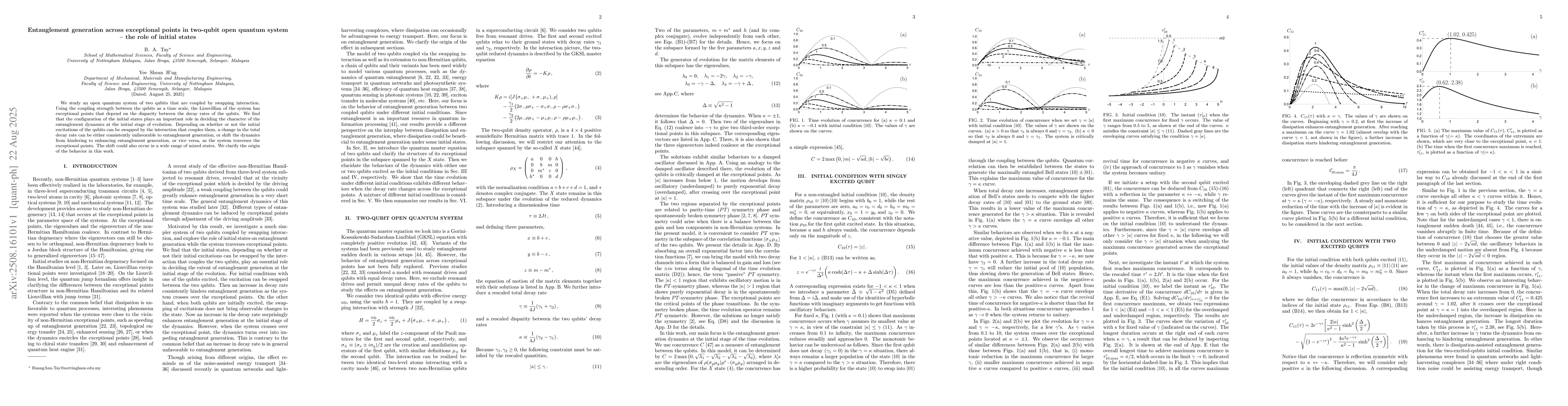 We study an open quantum system of two qubits that are coupled by swapping interaction. Using the coupling strength between the qubits as a time scale, the Liouvillian of the system has exceptional points that depend on the disparity between the decay rates of the qubits. We find that the configuration of the initial states plays an important role in deciding the character of the entanglement dynamics at the initial stage of evolution. Depending on whether or not the initial excitations of the qubits can be swapped by the interaction that couples them, a change in the total decay rate can be either consistently unfavorable to entanglement generation, or shift the dynamics from hindering to enhancing entanglement generation, or vice versa, as the system traverses the exceptional points. The shift could also occur in a wide range of mixed states. We clarify the origin of the behavior in this work.