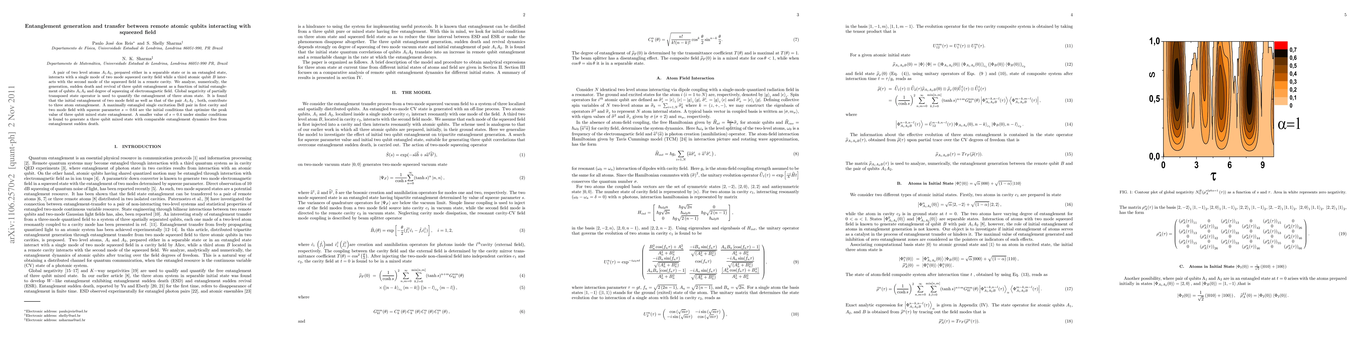 This paper investigates the generation and transfer of entanglement between remote atomic qubits interacting with a squeezed electromagnetic field, finding that initial entanglement and squeezing parameters significantly influence the dynamics and peak value of three-qubit entanglement. The optimal conditions for maximal entanglement involve a Bell pair and a squeezed field with a specific parameter.