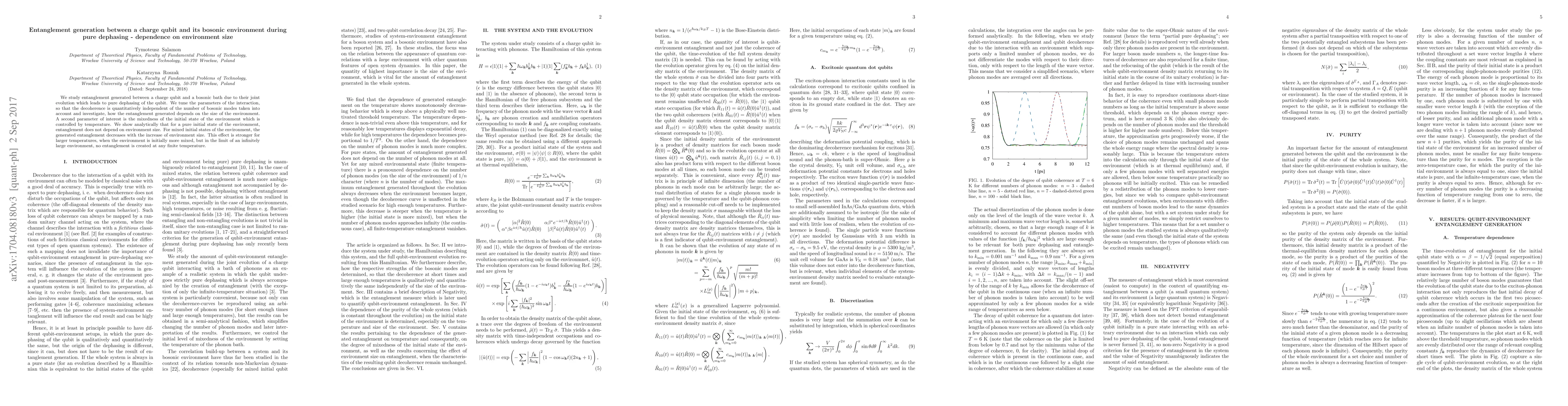 This paper investigates the entanglement generation between a charge qubit and a bosonic environment during pure dephasing, finding that entanglement is independent of environment size for pure initial states but decreases with larger environments and higher temperatures for mixed initial states. The study concludes that no entanglement is generated in an infinitely large environment at any finite temperature.