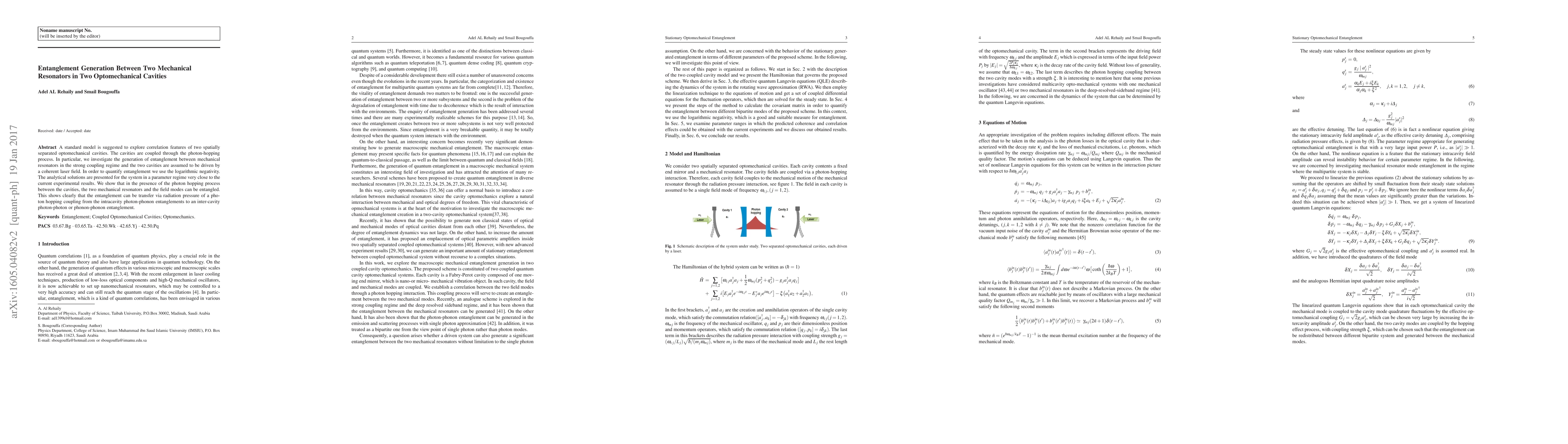 A standard model is suggested to explore correlation features of two spatially separated optomechanical cavities. The cavities are coupled through the photon-hopping process. In particular, we investigate the generation of entanglement between mechanical resonators in the strong coupling regime and the two cavities are assumed to be driven by a coherent laser field. In order to quantify entanglement we use the logarithmic negativity. The analytical solutions are presented for the system in a parameter regime very close to the current experimental results. We show that in the presence of the photon hopping process between the cavities, the two mechanical resonators and the field modes can be entangled. This shows clearly that the entanglement can be transfer via radiation pressure of a photon hopping coupling from the intracavity photon-phonon entanglements to an inter-cavity photon-photon or phonon-phonon entanglement.