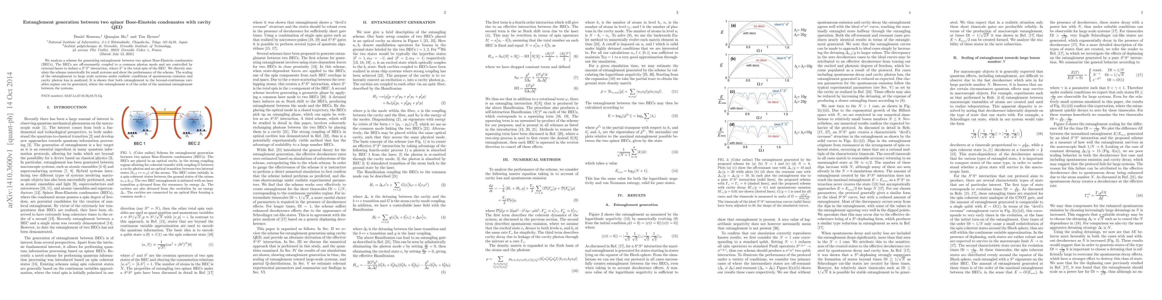 We analyze a scheme for generating entanglement between two spinor Bose-Einstein condensates (BECs). The BECs are off-resonantly coupled to a common photon mode and are controlled by external lasers to induce a $ S^z S^z $ interaction, where $ S^z $ is the total spin of the BEC. We directly simulate the scheme numerically for small systems and show the performance of the scheme. The scaling of the entanglement to large scale systems under realistic conditions of spontaneous emission and cavity photon loss is analyzed. It is shown that both entanglement in the beyond-continuous variables regime can be generated, where the entanglement is of the order of the maximal entanglement between the systems.