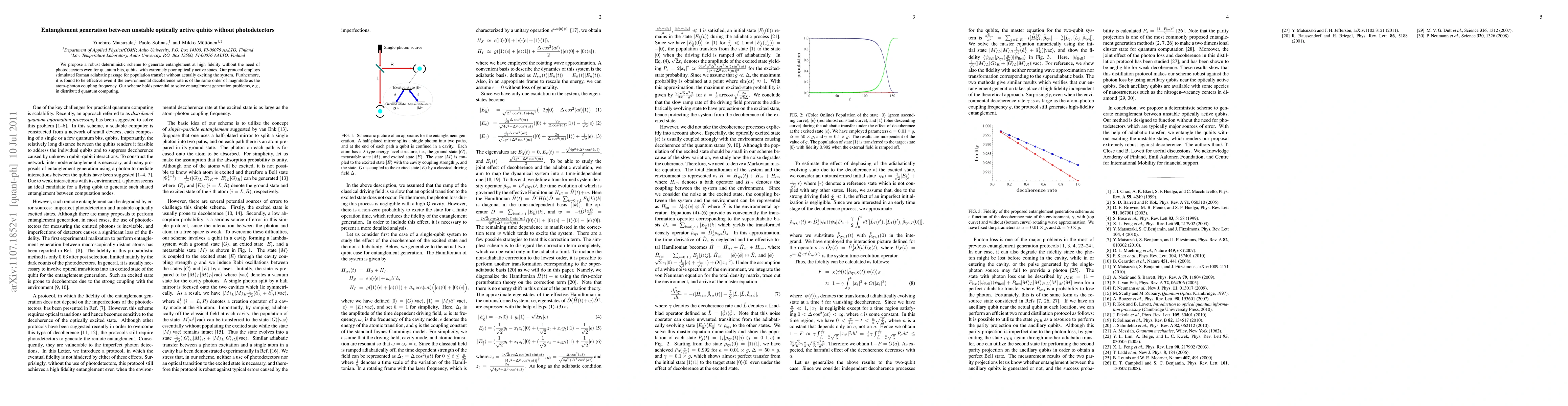 This paper proposes a novel method to generate high-fidelity entanglement between unstable optically active qubits using stimulated Raman adiabatic passage, eliminating the need for photodetectors and effectively managing environmental decoherence, which is crucial for distributed quantum computing applications.