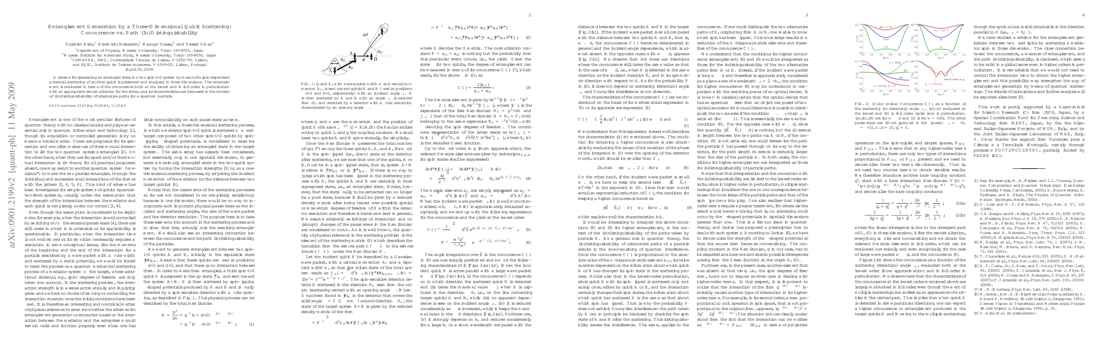 Researchers developed a method to generate entangled states in a two-qubit system using scattering of another qubit with a spin-dependent potential. The study explores the concurrence of entanglement and its characteristics in terms of distinguishability of alternative paths.