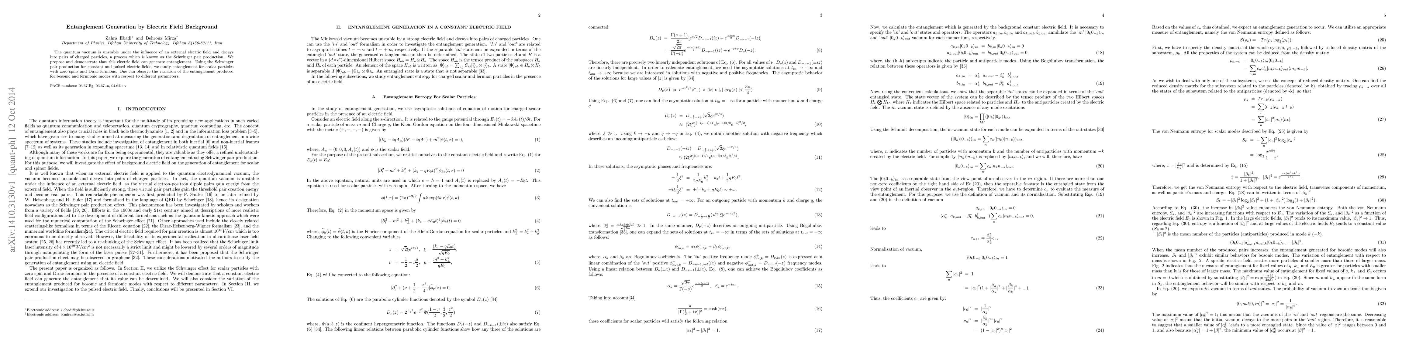Researchers demonstrate that an electric field can generate entanglement through Schwinger pair production, a process where charged particles emerge from the quantum vacuum. The study explores entanglement for different particle types and parameters, revealing variations in bosonic and fermionic modes.