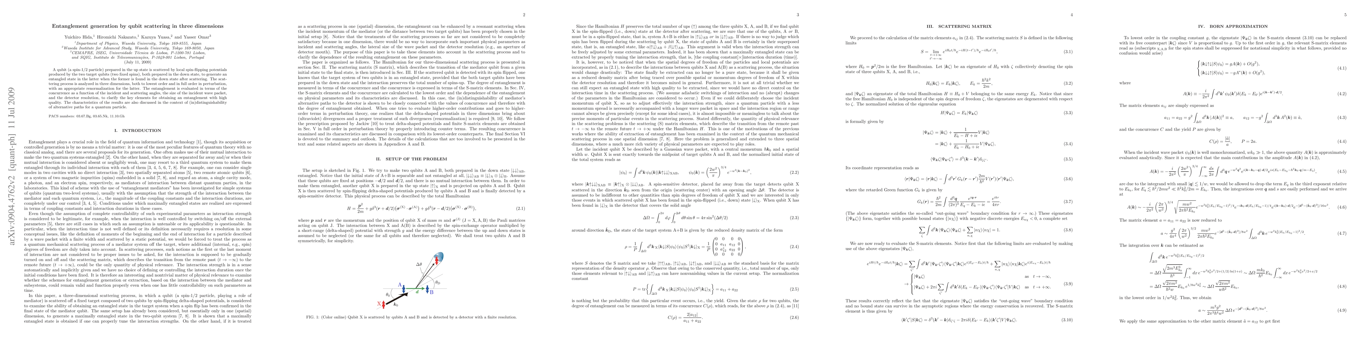 A qubit (a spin-1/2 particle) prepared in the up state is scattered by local spin-flipping potentials produced by the two target qubits (two fixed spins), both prepared in the down state, to generate an entangled state in the latter when the former is found in the down state after scattering. The scattering process is analyzed in three dimensions, both to lowest order and in full order in perturbation, with an appropriate renormalization for the latter. The entanglement is evaluated in terms of the concurrence as a function of the incident and scattering angles, the size of the incident wave packet, and the detector resolution, to clarify the key elements for obtaining an entanglement with high quality. The characteristics of the results are also discussed in the context of (in)distinguishability of alternative paths for a quantum particle.