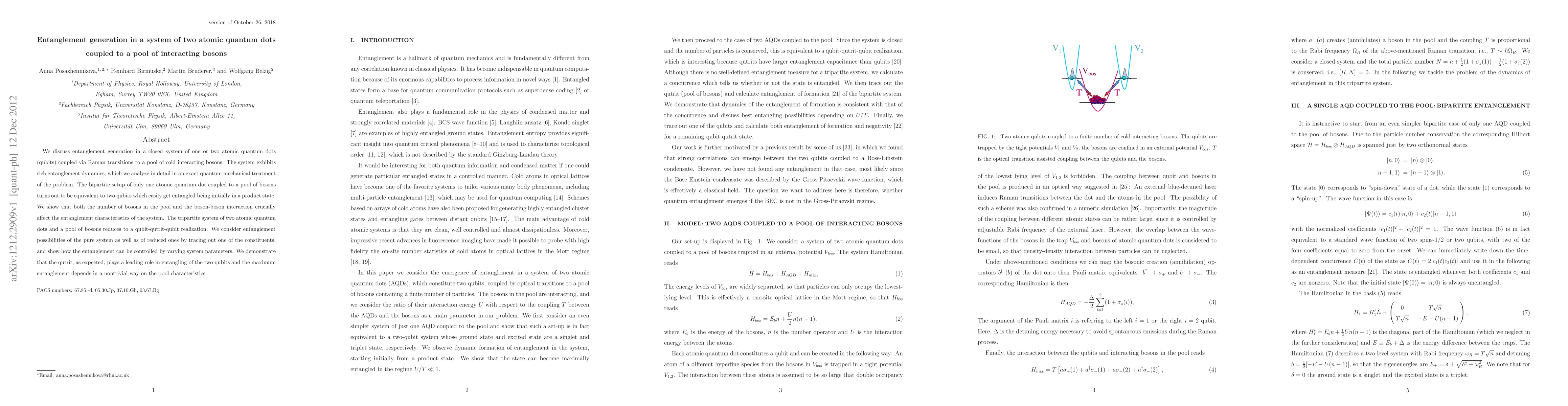 We discuss entanglement generation in a closed system of one or two atomic quantum dots (qubits) coupled via Raman transitions to a pool of cold interacting bosons. The system exhibits rich entanglement dynamics, which we analyze in detail in an exact quantum mechanical treatment of the problem. The bipartite setup of only one atomic quantum dot coupled to a pool of bosons turns out to be equivalent to two qubits which easily get entangled being initially in a product state. We show that both the number of bosons in the pool and the boson-boson interaction crucially affect the entanglement characteristics of the system. The tripartite system of two atomic quantum dots and a pool of bosons reduces to a qubit-qutrit-qubit realization. We consider entanglement possibilities of the pure system as well as of reduced ones by tracing out one of the constituents, and show how the entanglement can be controlled by varying system parameters. We demonstrate that the qutrit, as expected, plays a leading role in entangling of the two qubits and the maximum entanglement depends in a nontrivial way on the pool characteristics.