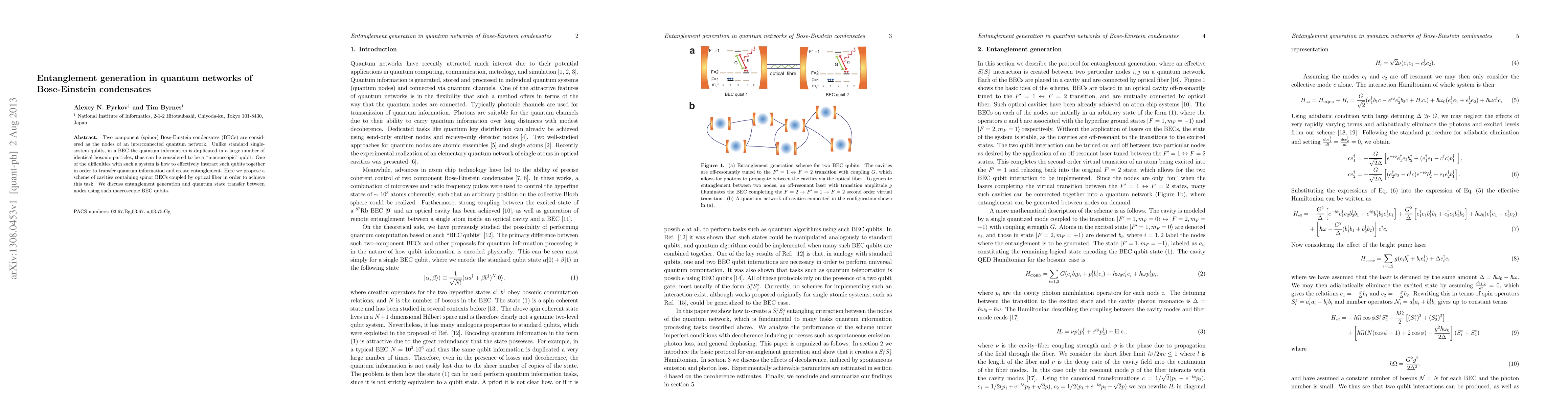 This paper proposes a scheme for generating entanglement in quantum networks using two-component Bose-Einstein condensates (BECs) as macroscopic qubits. It suggests using cavities containing spinor BECs coupled via optical fibers to transfer quantum information and create entanglement between these nodes.