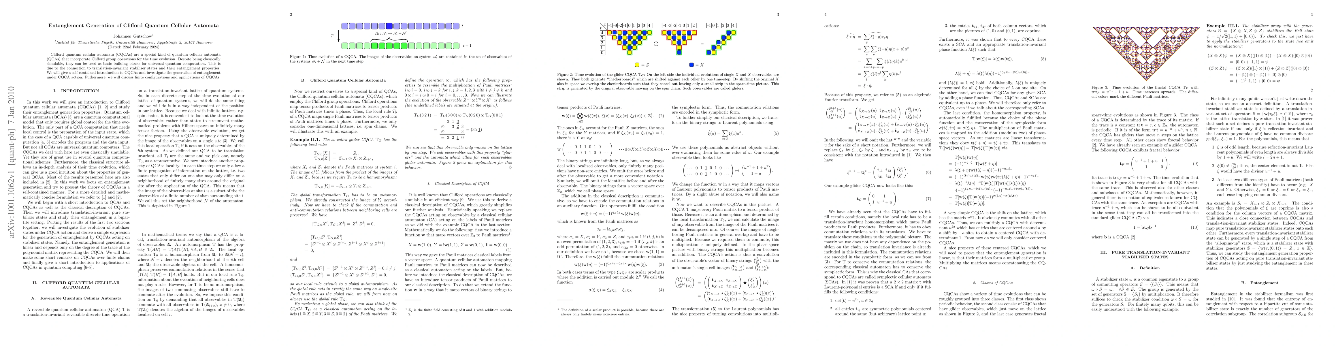 This paper introduces Clifford quantum cellular automata (CQCAs) and explores their entanglement generation properties. It highlights their potential as universal quantum computation building blocks due to their connection to translation-invariant stabilizer states.