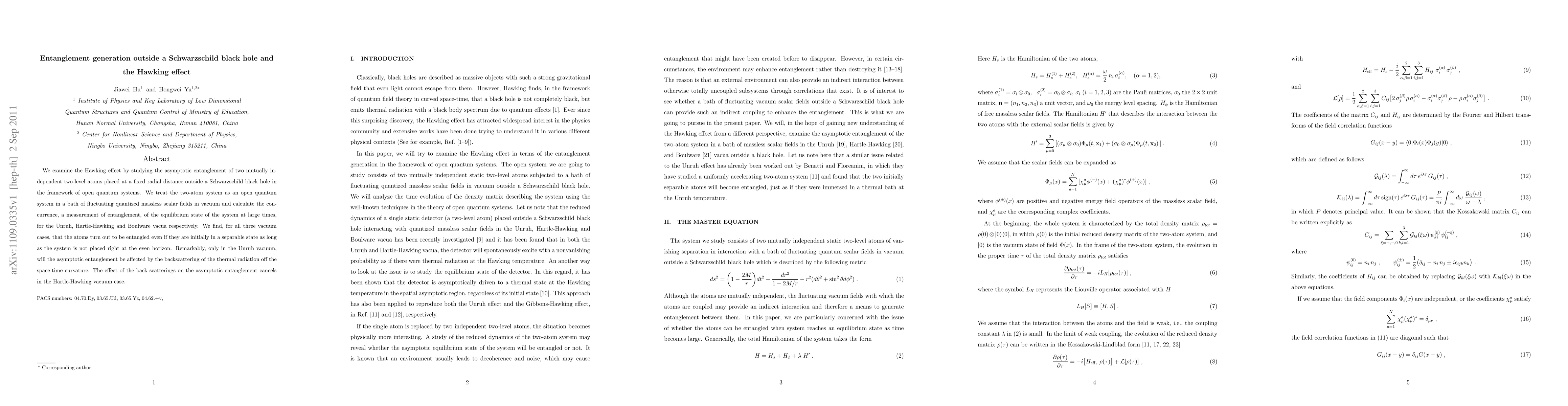 This paper investigates the entanglement generation between two independent atoms outside a Schwarzschild black hole, revealing that they become entangled over time due to the Hawking effect, regardless of initial state, except near the event horizon. The study finds that while the Unruh vacuum shows entanglement affected by thermal radiation backscattering, the Hartle-Hawking vacuum neutralizes this effect.