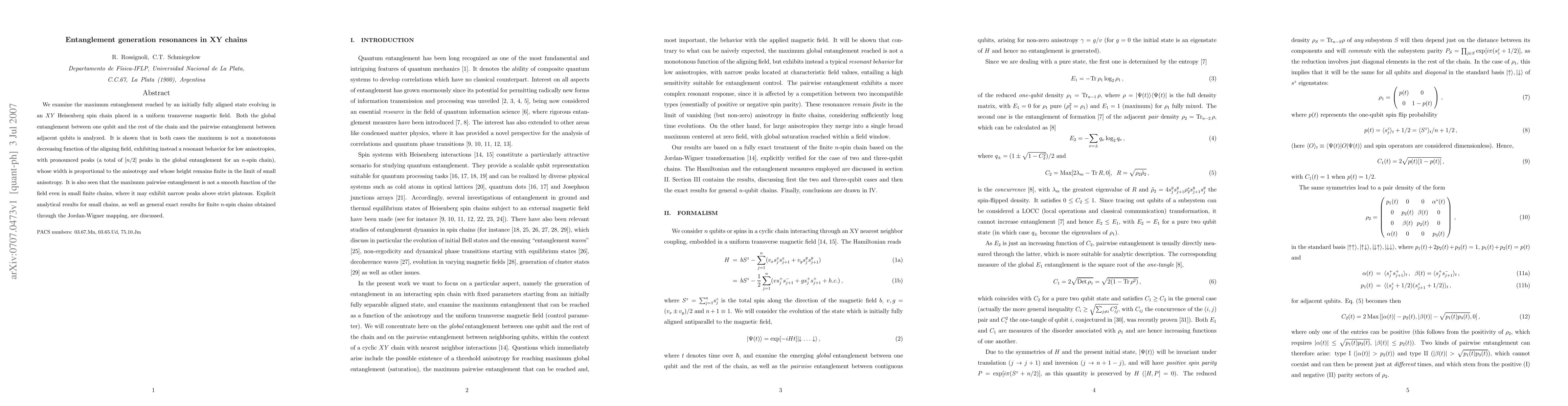 This paper investigates the entanglement generation in XY Heisenberg spin chains under a uniform transverse magnetic field, revealing resonant peaks in both global and pairwise entanglement that do not monotonously decrease with the aligning field. Analytical results show that the entanglement peaks' width and height are proportional to the anisotropy and remain finite in small anisotropy limits.