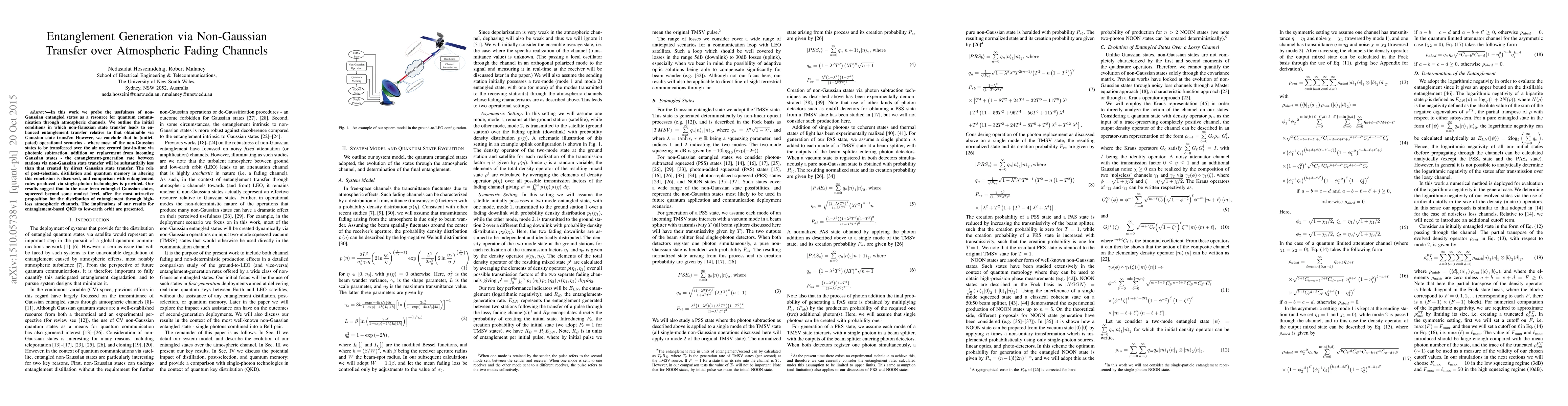 This paper investigates the potential of non-Gaussian entangled states for quantum communication over atmospheric channels, finding that while they offer enhanced entanglement transfer under ideal conditions, their practical use is limited due to the prevalent use of Gaussian states. The study concludes that entangled Gaussian states, when squeezed, provide the most feasible solution for entanglement distribution in high-loss channels, with implications for entanglement-based quantum key distribution.