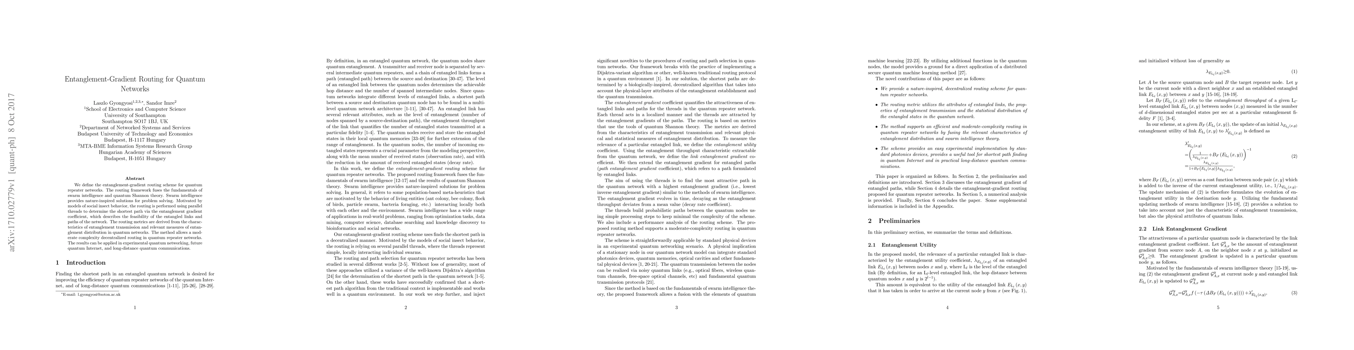 This paper introduces an entanglement-gradient routing scheme for quantum repeater networks, combining swarm intelligence and quantum Shannon theory to achieve decentralized routing with moderate complexity. The method leverages parallel threads and entanglement gradient coefficients to determine optimal paths, applicable to experimental quantum networking and future quantum Internet.