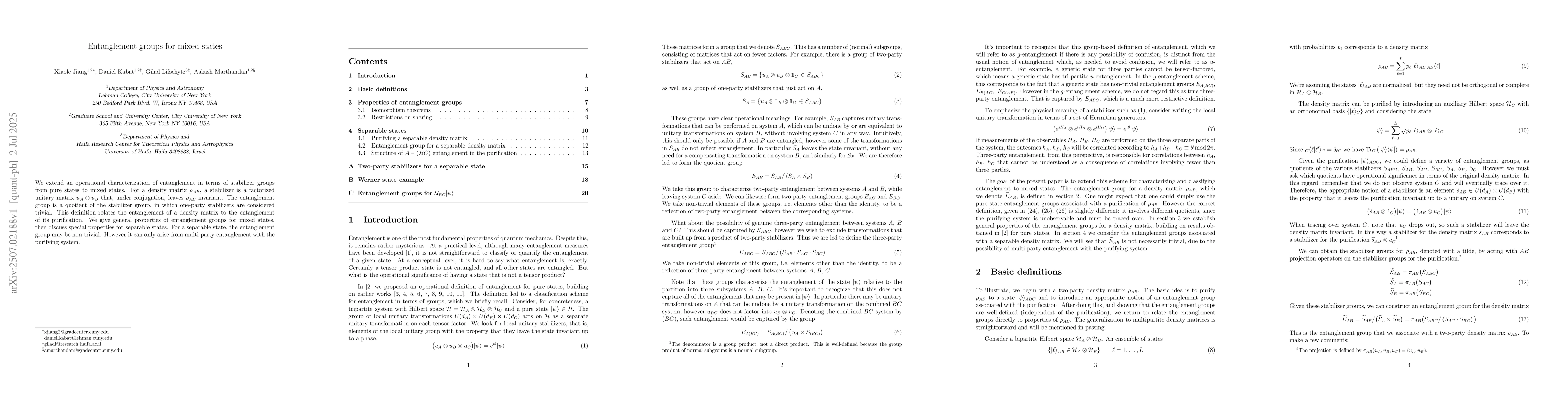 We extend an operational characterization of entanglement in terms of stabilizer groups from pure states to mixed states. For a density matrix $\rho_{AB}$, a stabilizer is a factorized unitary matrix $u_A \otimes u_B$ that, under conjugation, leaves $\rho_{AB}$ invariant. The entanglement group is a quotient of the stabilizer group, in which one-party stabilizers are considered trivial. This definition relates the entanglement of a density matrix to the entanglement of its purification. We give general properties of entanglement groups for mixed states, then discuss special properties for separable states. For a separable state, the entanglement group may be non-trivial. However it can only arise from multi-party entanglement with the purifying system.