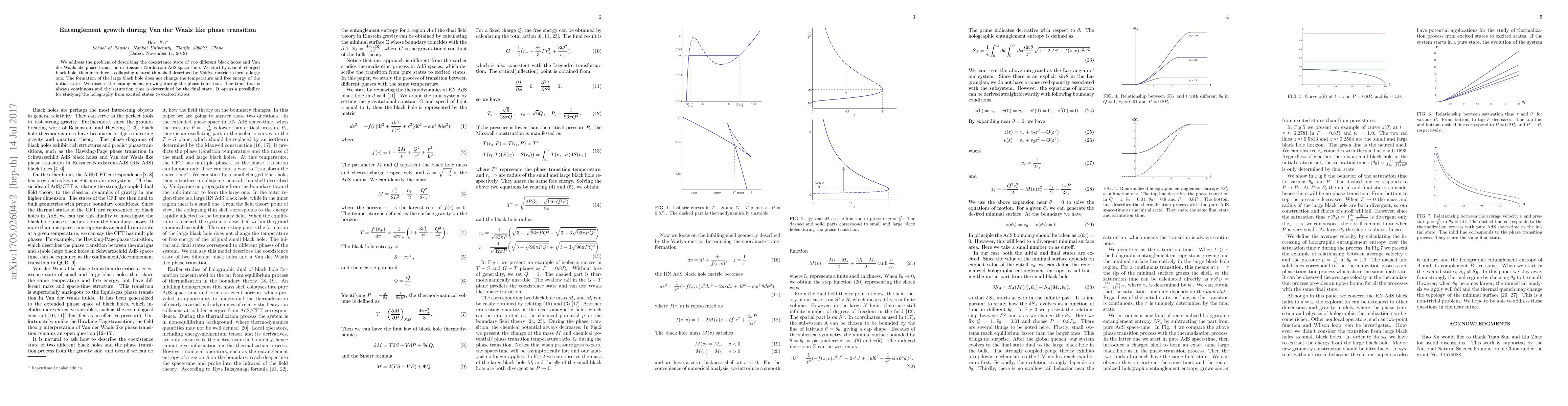 We address the problem of describing the coexistence state of two different black holes and Van der Waals like phase transition in Reissner-Nordstr\"om-AdS space-time. We start by a small charged black hole, then introduce a collapsing neutral thin-shell described by Vaidya metric to form a large one. The formation of the large black hole does not change the temperature and free energy of the initial state. We discuss the entanglement growing during the phase transition. The transition is always continuous and the saturation time is determined by the final state. It opens a possibility for studying the holography from excited states to excited states.