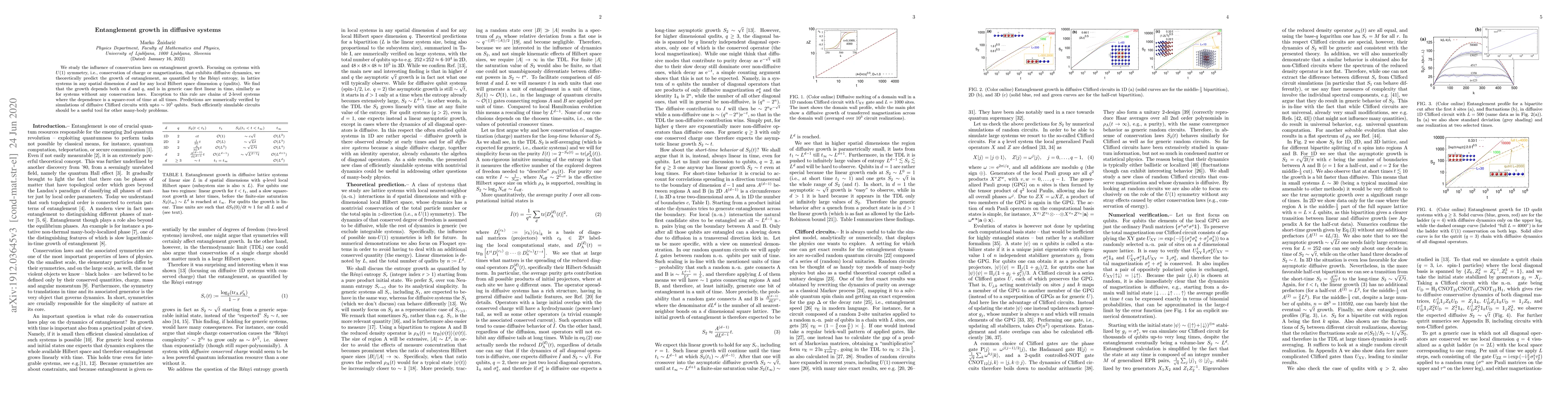 We study the influence of conservation laws on entanglement growth. Focusing on systems with U(1) symmetry, i.e., conservation of charge or magnetization, that exhibits diffusive dynamics, we theoretically predict the growth of entanglement, as quantified by the Renyi entropy, in lattice systems in any spatial dimension d and for any local Hilbert space dimension q (qudits). We find that the growth depends both on d and q, and is in generic case first linear in time, similarly as for generic systems without any conservation laws. Exception to this rule are chains of 2-level systems where the dependence is a square-root of time at all times. Predictions are numerically verified by simulations of diffusive Clifford circuits with upto 10^5 qubits. Such efficiently simulable circuits should be a useful tool for other many-body problems.