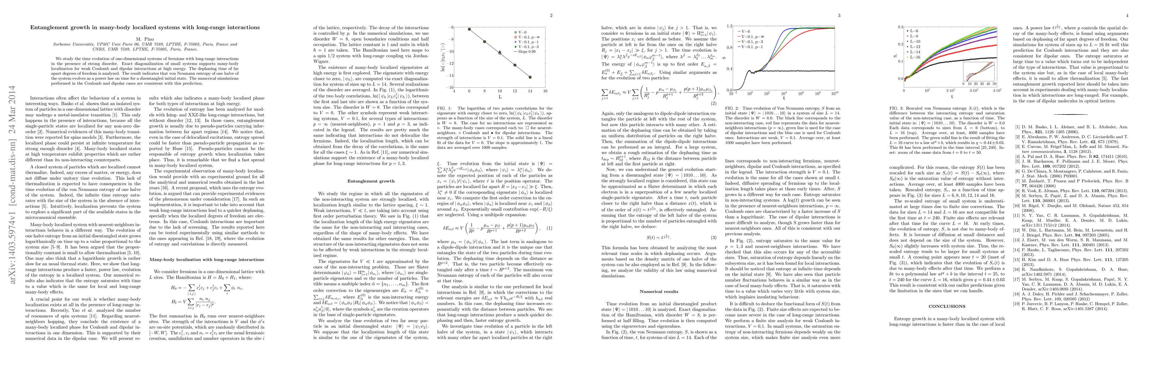 This paper investigates the entanglement growth in one-dimensional fermionic systems with long-range interactions under strong disorder, finding that many-body localization occurs for weak interactions. The study shows that the entropy of one half of the system evolves as a power law over time for a disentangled initial state, consistent with numerical simulations.