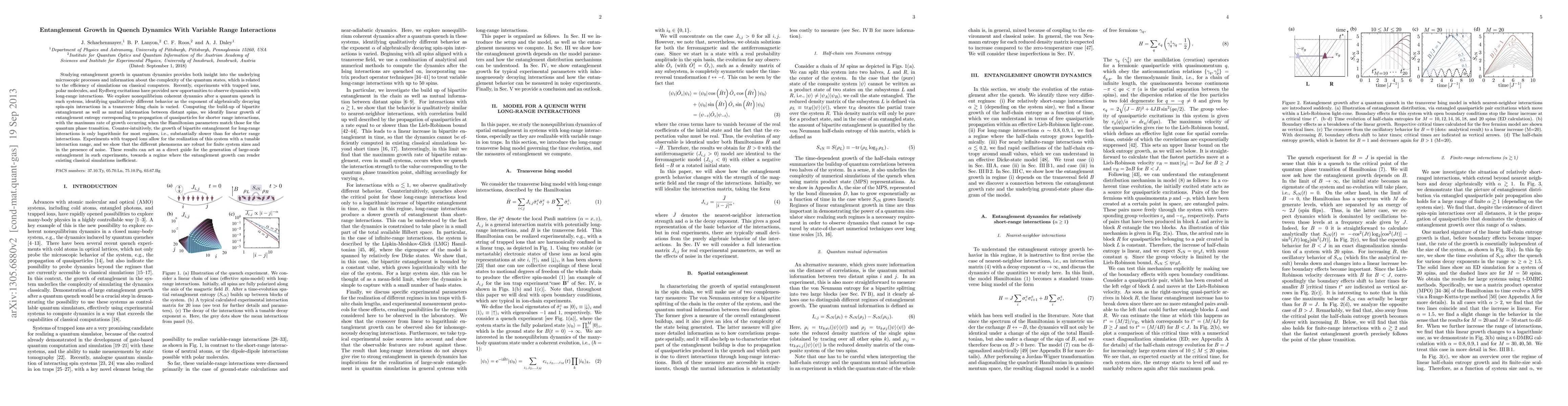 This paper investigates the growth of entanglement in quantum systems with variable range interactions following a quantum quench, revealing that entanglement growth is linear for short-range interactions but only logarithmic for long-range interactions, despite the latter's stronger interactions. The findings suggest that tunable interaction systems, like those in trapped ions, can efficiently generate large-scale entanglement.