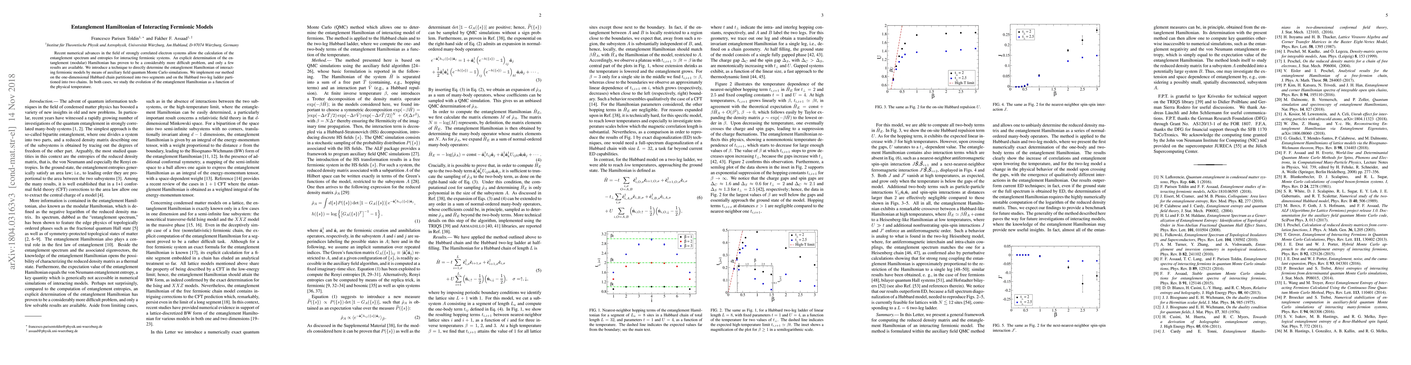 This paper introduces a new method using auxiliary field quantum Monte Carlo simulations to determine the entanglement Hamiltonian for interacting fermionic models, applying it to the one-dimensional Hubbard chain and the Hubbard two-leg ladder. The study examines the entanglement Hamiltonian's evolution with temperature in these systems.