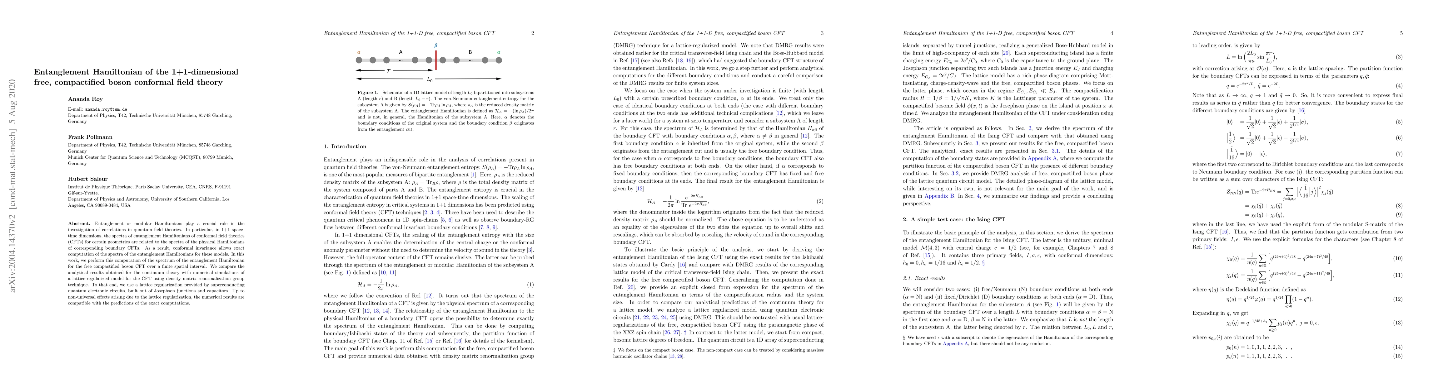 This paper computes the entanglement Hamiltonian spectrum for the 1+1-dimensional free compactified boson conformal field theory, demonstrating conformal invariance's role in exact calculations. Numerical simulations using superconducting quantum circuits match analytical results, validating the theoretical predictions.