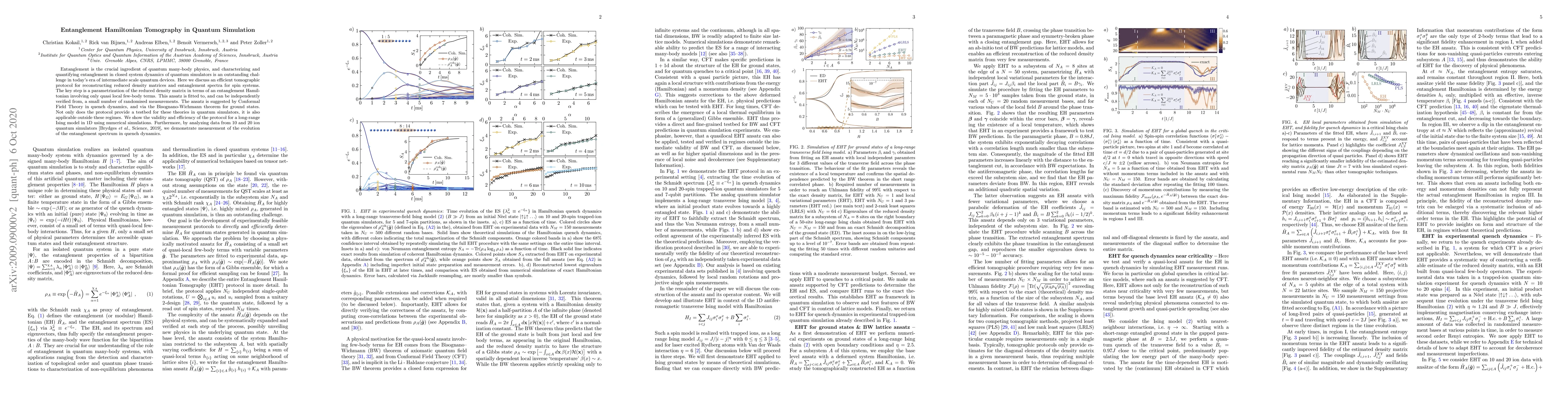Entanglement is the crucial ingredient of quantum many-body physics, and characterizing and quantifying entanglement in closed system dynamics of quantum simulators is an outstanding challenge in today's era of intermediate scale quantum devices. Here we discuss an efficient tomographic protocol for reconstructing reduced density matrices and entanglement spectra for spin systems. The key step is a parametrization of the reduced density matrix in terms of an entanglement Hamiltonian involving only quasi local few-body terms. This ansatz is fitted to, and can be independently verified from, a small number of randomised measurements. The ansatz is suggested by Conformal Field Theory in quench dynamics, and via the Bisognano-Wichmann theorem for ground states. Not only does the protocol provide a testbed for these theories in quantum simulators, it is also applicable outside these regimes. We show the validity and efficiency of the protocol for a long-range Ising model in 1D using numerical simulations. Furthermore, by analyzing data from $10$ and $20$ ion quantum simulators [Brydges \textit{et al.}, Science, 2019], we demonstrate measurement of the evolution of the entanglement spectrum in quench dynamics.