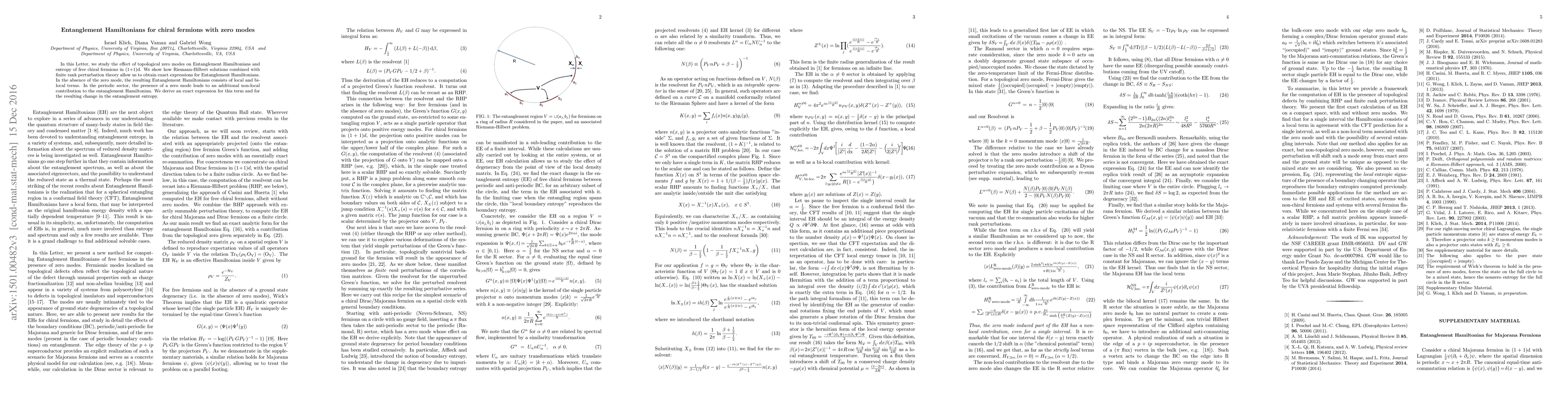 In this Letter we study the effect of topological zero modes on entanglement Hamiltonians and entropy of free chiral fermion systems in (1+1)d. We show how Riemann-Hilbert solutions combined with finite rank perturbation theory allow us to obtain explicit expressions for entanglement Hamiltonians. We consider both chiral Majorana and Dirac fermions, and explore the effects of boundary conditions (periodic/anti-periodic for Majorana and generic for Dirac) and associated zero modes on entanglement. In the periodic sector, we derive explicitly the non-local contribution to the entanglement Hamiltonian due to the zero mode, and show an exact expression for the change in entanglement entropy due to the zero mode.