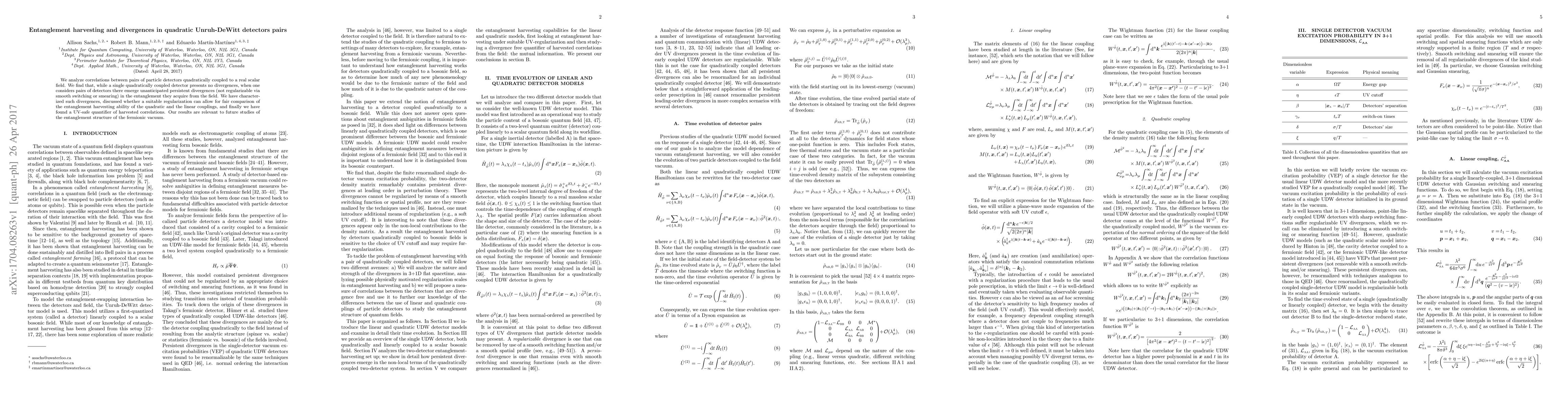 This paper investigates entanglement correlations between pairs of quadratic Unruh-DeWitt detectors coupled to a scalar field, revealing persistent divergences in the entanglement that cannot be regularized. It proposes a UV-safe quantifier for harvested correlations and discusses implications for future studies on the entanglement structure of the fermionic vacuum.