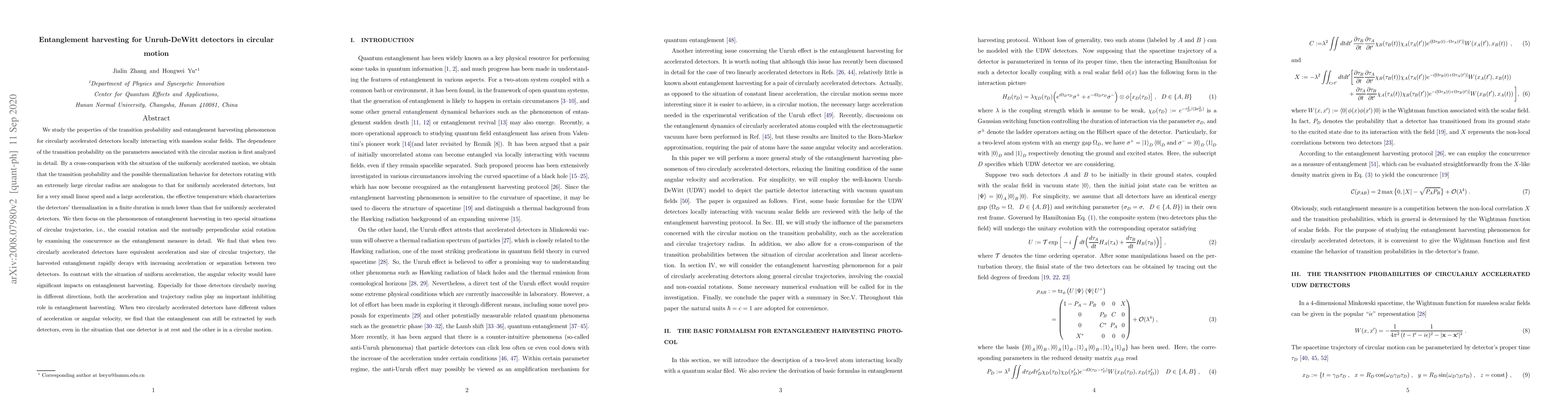 The paper presents detailed numerical analyses and derivations of transition probabilities and non-local correlations for circularly accelerated UDW detectors, providing a comprehensive study of entanglement harvesting in this context.