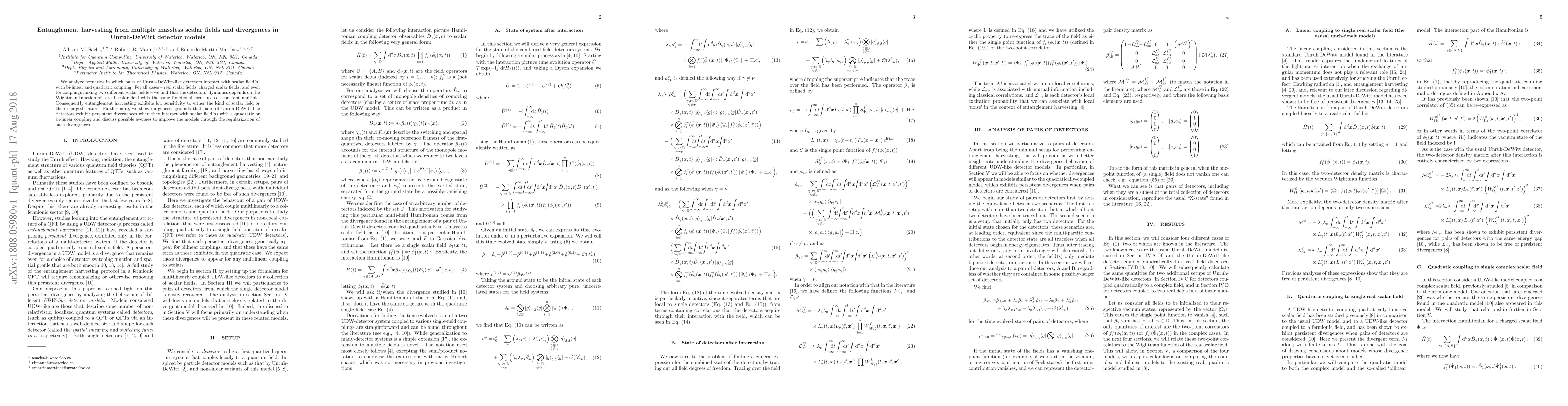 This paper investigates the entanglement harvesting from multiple massless scalar fields using Unruh-DeWitt detectors, revealing that detector dynamics depend on the Wightman function of a real scalar field. It also identifies persistent divergences in detector models with quadratic or bi-linear couplings and discusses regularization methods to mitigate these issues.