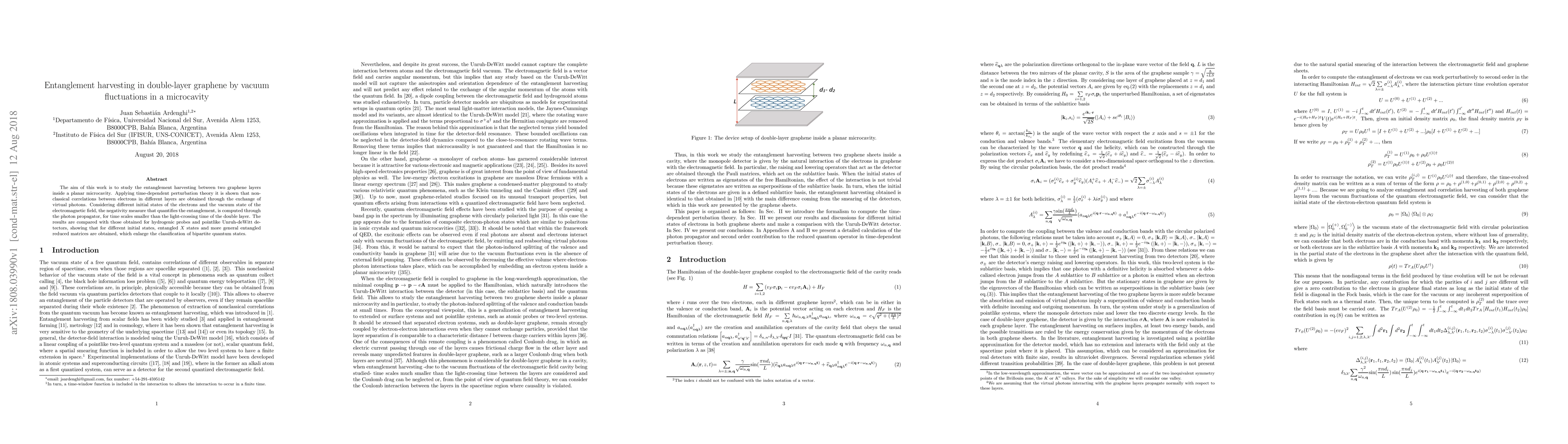 The aim of this work is to study the entanglement harvesting between two graphene layers inside a planar microcavity. Applying time-dependent perturbation theory it is shown that nonclassical correlations between electrons in different layers are obtained through the exchange of virtual photons. Considering different initial states of the electrons and the vacuum state of the electromagnetic field, the negativity measure that quantifies the entanglement is computed through the photon propagator for time scales smaller than the light-crossing time of the double layer. The results are compared with those obtained for hydrogenic probes and pointlike Unruh-DeWitt detectors, showing that for different initial states, entangled X states and more general entangled reduced matrices are obtained, which enlarge the classification of bipartite quantum states.
