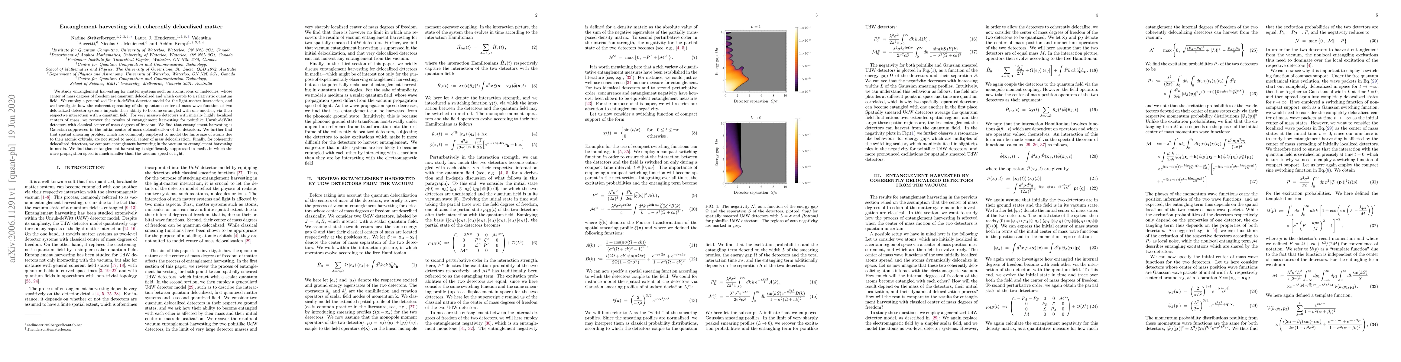 We study entanglement harvesting for matter systems such as atoms, ions or molecules, whose center of mass degrees of freedom are quantum delocalized and which couple to a relativistic quantum field. We employ a generalized Unruh-deWitt detector model for the light-matter interaction, and we investigate how the coherent spreading of the quantum center of mass wave function of two delocalized detector systems impacts their ability to become entangled with one another, via their respective interaction with a quantum field. For very massive detectors with initially highly localized centers of mass, we recover the results of entanglement harvesting for pointlike Unruh-deWitt detectors with classical center of mass degrees of freedom. We find that entanglement harvesting is Gaussian suppressed in the initial center of mass delocalization of the detectors. We further find that spatial smearing profiles, which are commonly employed to model the finite size of atoms due to their atomic orbitals, are not suited to model center of mass delocalization. Finally, for coherently delocalized detectors, we compare entanglement harvesting in the vacuum to entanglement harvesting in media. We find that entanglement harvesting is significantly suppressed in media in which the wave propagation speed is much smaller than the vacuum speed of light.