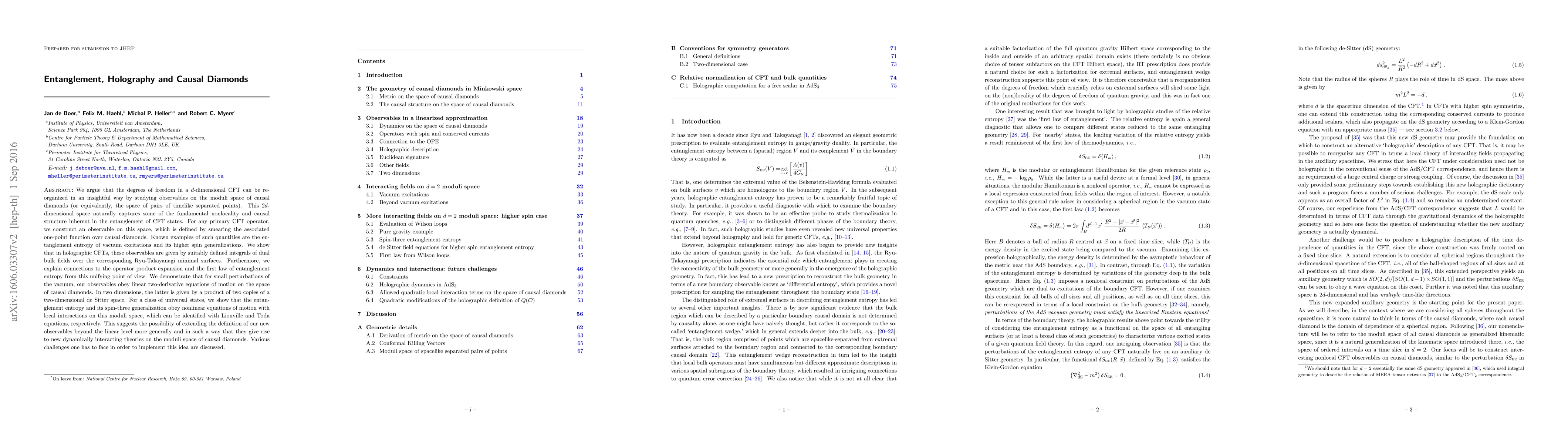 We argue that the degrees of freedom in a d-dimensional CFT can be re-organized in an insightful way by studying observables on the moduli space of causal diamonds (or equivalently, the space of pairs of timelike separated points). This 2d-dimensional space naturally captures some of the fundamental nonlocality and causal structure inherent in the entanglement of CFT states. For any primary CFT operator, we construct an observable on this space, which is defined by smearing the associated one-point function over causal diamonds. Known examples of such quantities are the entanglement entropy of vacuum excitations and its higher spin generalizations. We show that in holographic CFTs, these observables are given by suitably defined integrals of dual bulk fields over the corresponding Ryu-Takayanagi minimal surfaces. Furthermore, we explain connections to the operator product expansion and the first law of entanglement entropy from this unifying point of view. We demonstrate that for small perturbations of the vacuum, our observables obey linear two-derivative equations of motion on the space of causal diamonds. In two dimensions, the latter is given by a product of two copies of a two-dimensional de Sitter space. For a class of universal states, we show that the entanglement entropy and its spin-three generalization obey nonlinear equations of motion with local interactions on this moduli space, which can be identified with Liouville and Toda equations, respectively. This suggests the possibility of extending the definition of our new observables beyond the linear level more generally and in such a way that they give rise to new dynamically interacting theories on the moduli space of causal diamonds. Various challenges one has to face in order to implement this idea are discussed.