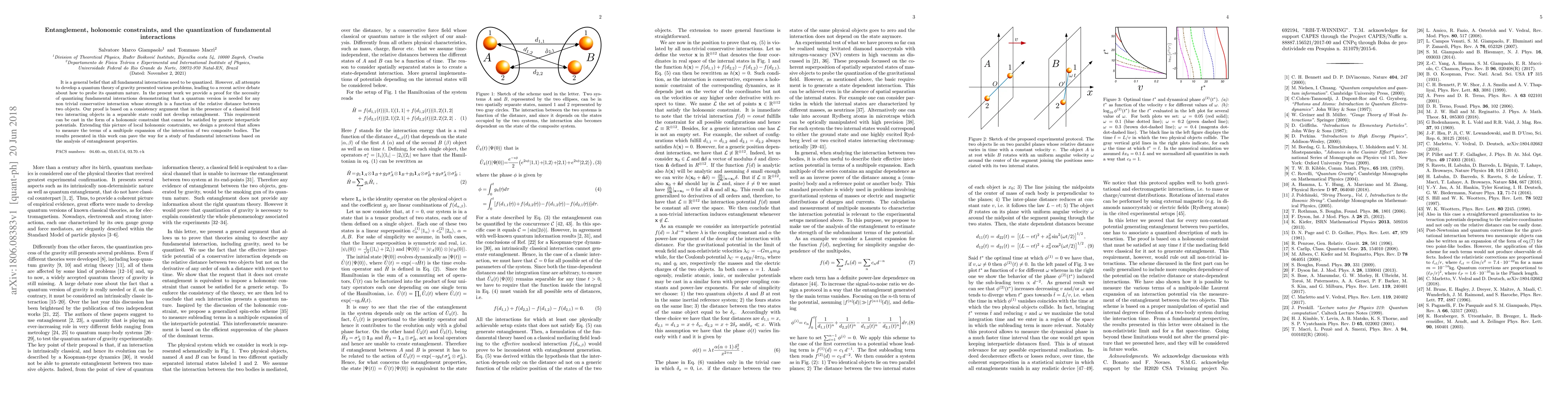 It is a general belief that all fundamental interactions need to be quantized. However, all attempts to develop a quantum theory of gravity presented various problems, leading to a recent active debate about how to probe its quantum nature. In the present work we provide a proof for the necessity of quantizing fundamental interactions demonstrating that a quantum version is needed for any non trivial conservative interaction whose strength is a function of the relative distance between two objects. Our proof is based on a consistency argument that in the presence of a classical field two interacting objects in a separable state could not develop entanglement. This requirement can be cast in the form of a holonomic constraint that cannot be satisfied by generic interparticle potentials. Extending this picture of local holonomic constraints, we design a protocol that allows to measure the terms of a multipole expansion of the interaction of two composite bodies. The results presented in this work can pave the way for a study of fundamental interactions based on the analysis of entanglement properties.