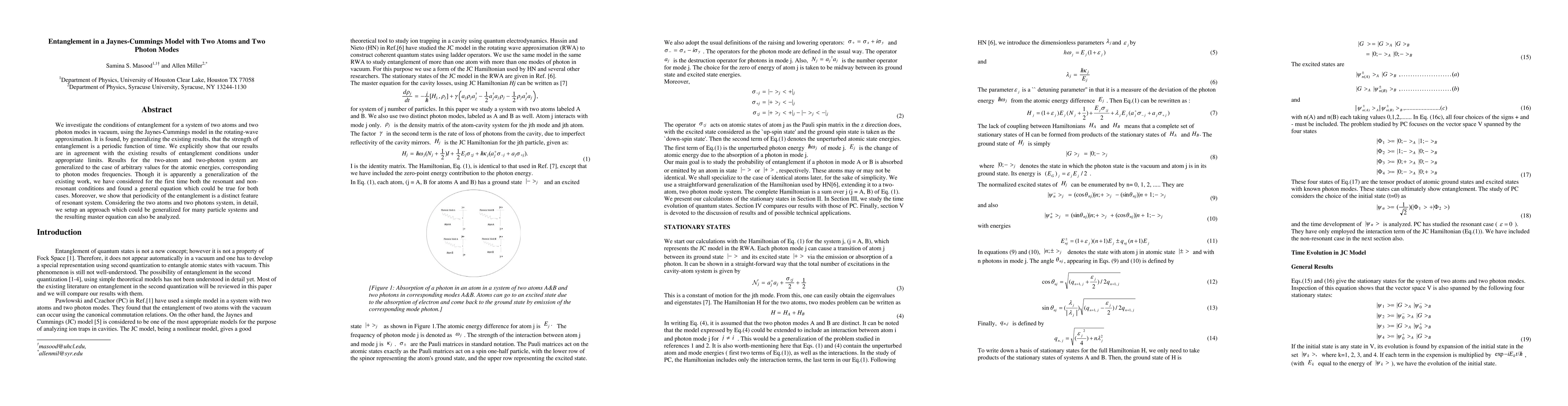 This paper investigates entanglement in a Jaynes-Cummings model with two atoms and two photon modes, finding that the strength of entanglement is a periodic function of time. It provides a general equation for both resonant and nonresonant conditions and outlines an approach for analyzing many-particle systems.