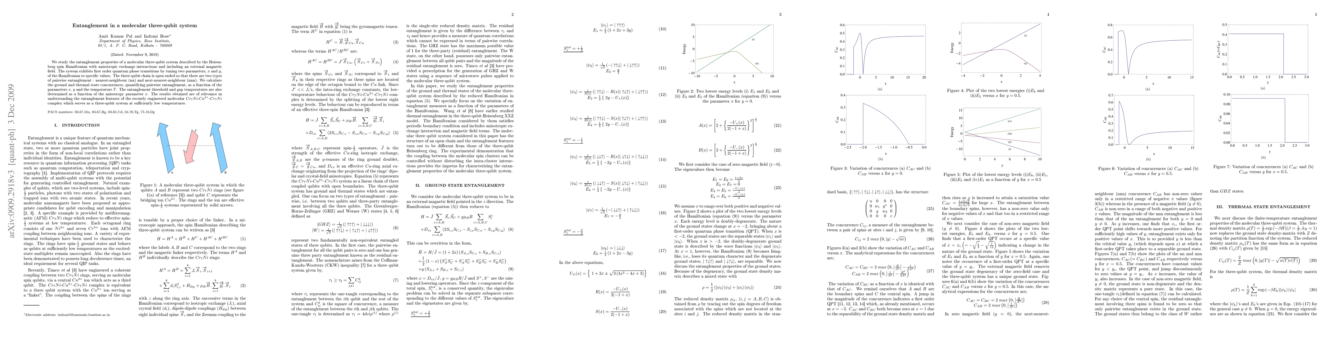 This study investigates the entanglement properties in a molecular three-qubit system under anisotropic exchange interactions and an external magnetic field, revealing first-order quantum phase transitions. It quantifies nearest-neighbour and next-nearest-neighbour entanglement through ground and thermal state concurrences, identifying entanglement thresholds and gap temperatures relevant to the $Cr_{7}Ni$-$Cu^{2+}$-$Cr_{7}Ni$ complex.