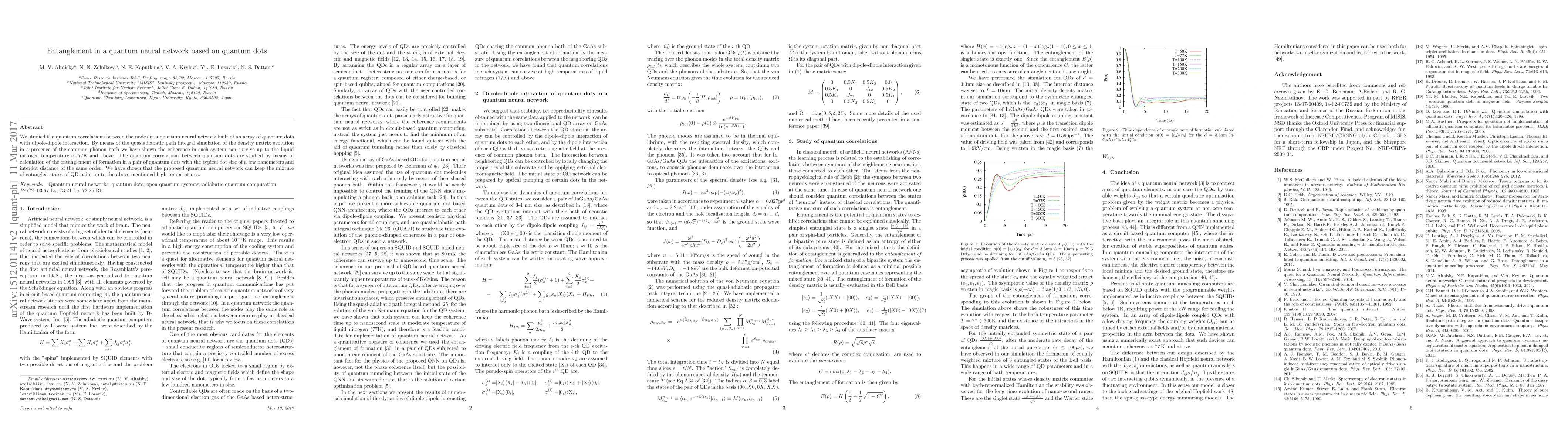 This paper investigates quantum correlations in a quantum neural network composed of quantum dots with dipole-dipole interactions, demonstrating that coherence and entanglement can persist up to 77K using quasiadiabatic path integral simulations. The study shows that the network can maintain entangled states of quantum dot pairs at these high temperatures.