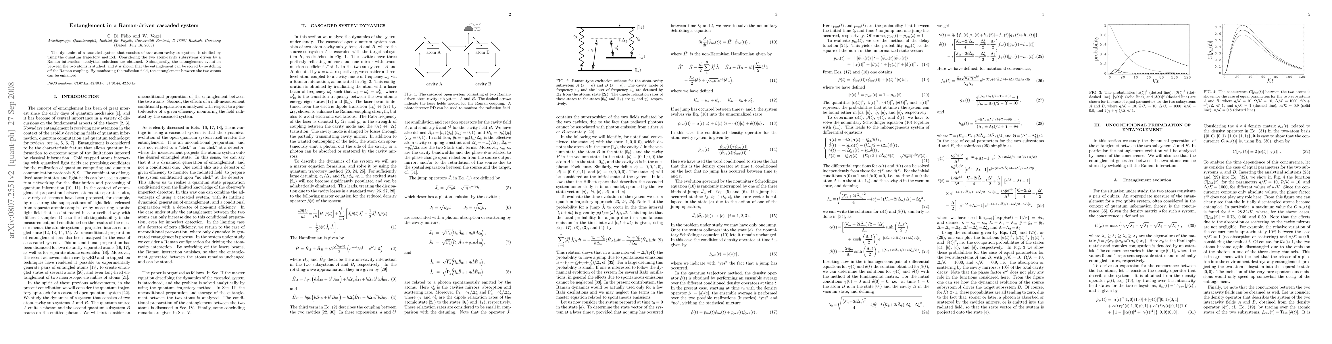 This paper investigates the dynamics of a Raman-driven cascaded system with two atom-cavity subsystems, deriving analytical solutions and demonstrating entanglement evolution. The study reveals that entanglement can be stored by halting Raman coupling and enhanced by monitoring the radiation field.