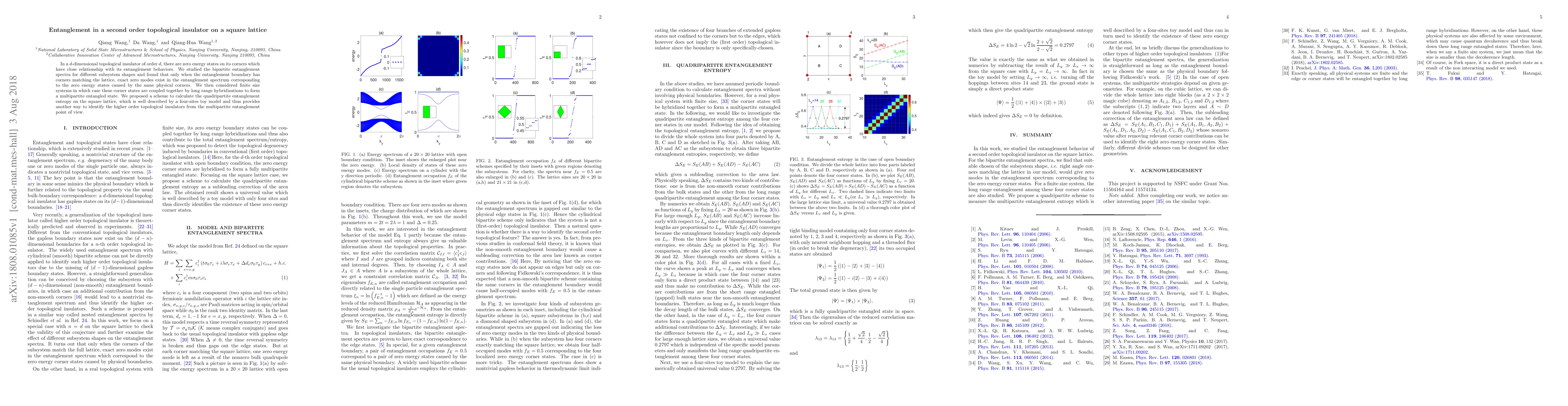 This paper investigates the entanglement spectra in a second-order topological insulator on a square lattice, revealing that exact zero modes in the entanglement spectrum correspond to zero energy states at the lattice's corners. It proposes a method to calculate quadripartite entanglement entropy to identify higher-order topological insulators through multipartite entanglement.