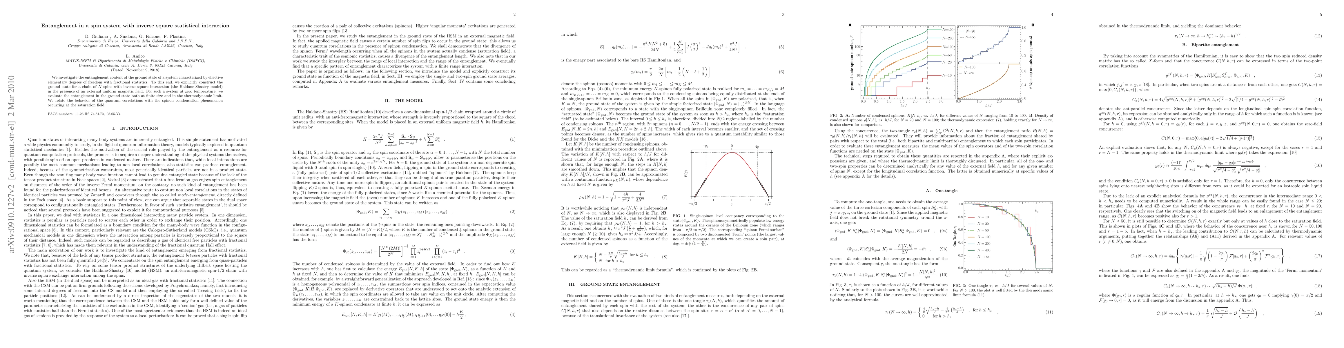 This paper explores the entanglement in the ground state of a spin system with fractional statistics and inverse square interaction, specifically the Haldane-Shastry model under a magnetic field. It evaluates the entanglement both at finite size and in the thermodynamic limit, linking quantum correlations to spinon condensation at saturation field.
