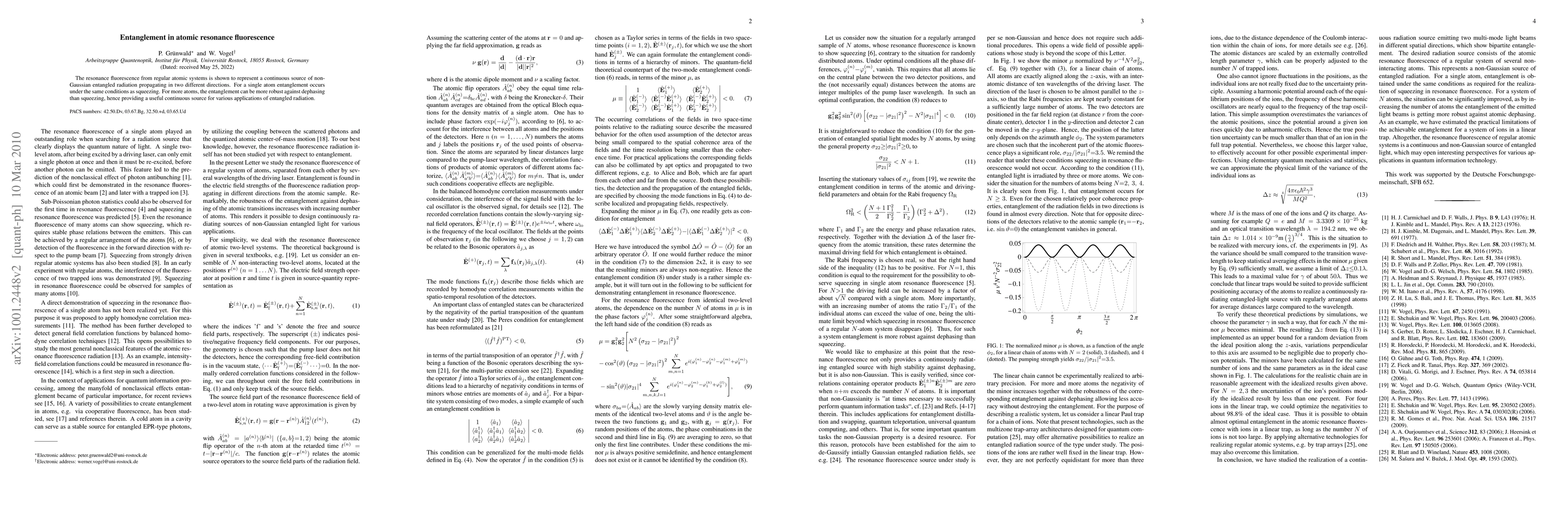 This paper demonstrates that atomic resonance fluorescence generates non-Gaussian entangled radiation in two directions, with single-atom entanglement occurring under conditions similar to squeezing. For multiple atoms, the entanglement is more resilient to dephasing than squeezing, making it a valuable continuous source for applications requiring entangled radiation.