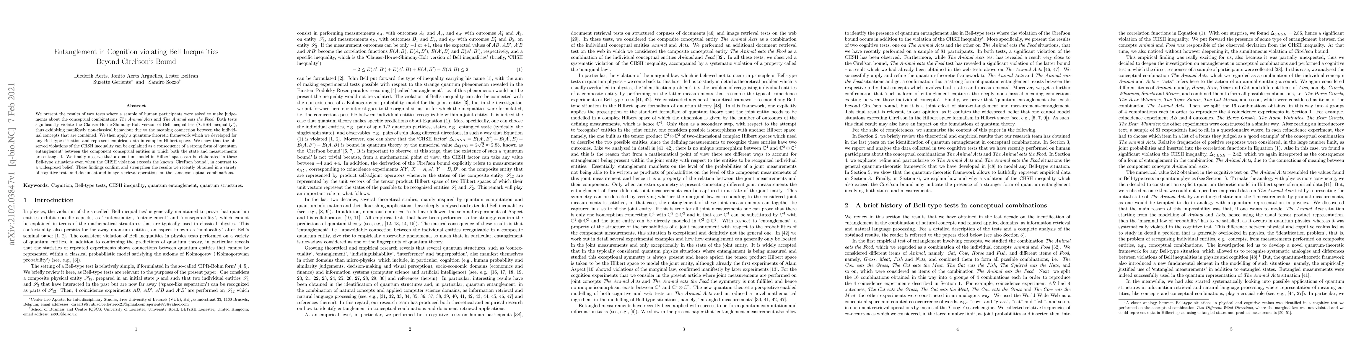 Human participants showed non-classical behavior in cognitive tests that violated Bell inequalities, suggesting quantum entanglement between conceptual entities. This finding challenges the existing Cirel'son bound.