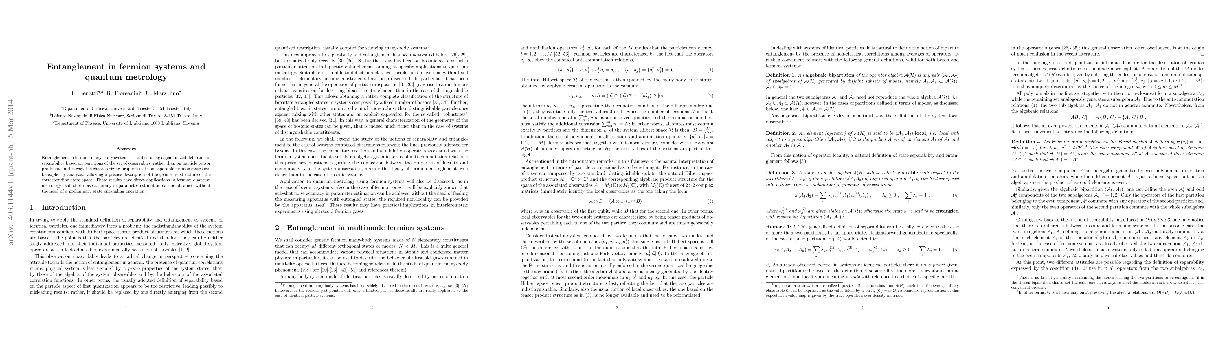This paper explores entanglement in fermion systems using a novel separability definition based on observable partitions, providing a detailed geometric analysis of non-separable states. It demonstrates the potential for achieving sub-shot noise accuracy in quantum metrology without requiring state entangling operations.