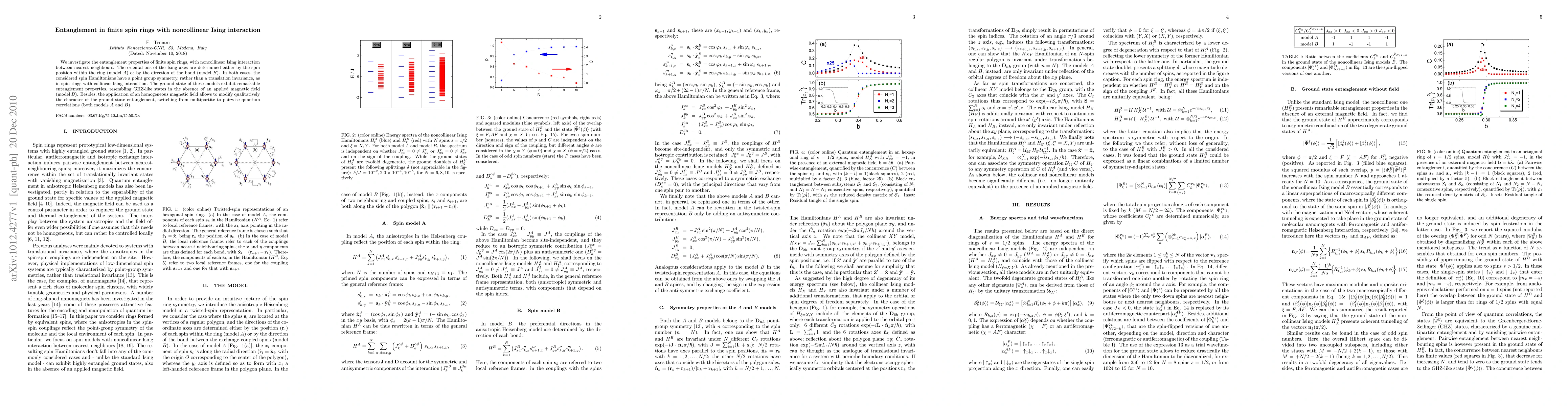 This paper explores the entanglement characteristics of finite spin rings with noncollinear Ising interactions, comparing two models (A and B) that differ in how the Ising axes are oriented. The study reveals that the ground state exhibits GHZ-like entanglement without an external magnetic field, which can be altered to pairwise quantum correlations by applying a magnetic field.