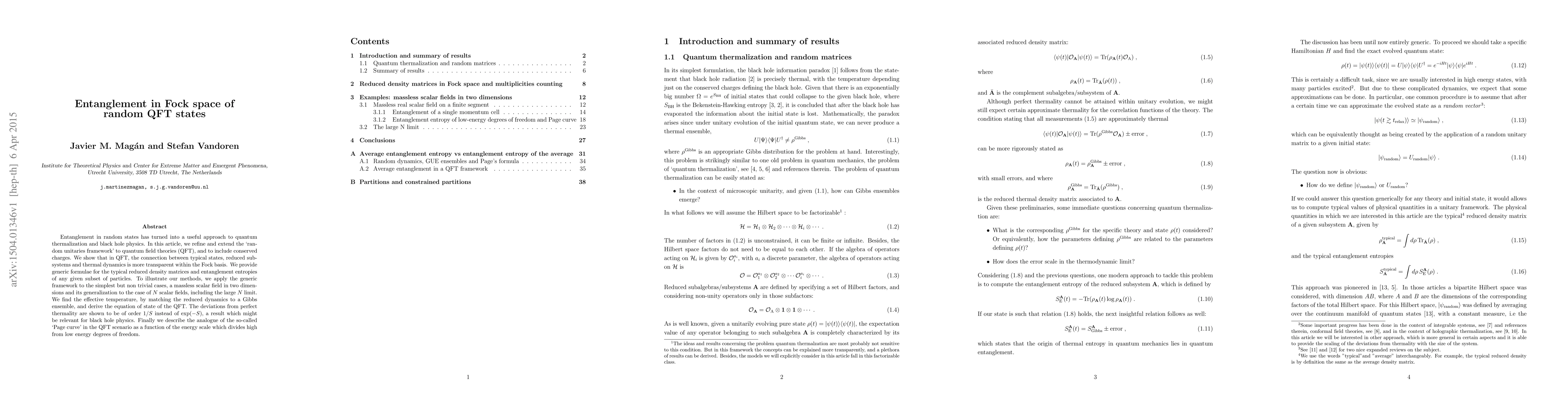 Entanglement in random states has turned into a useful approach to quantum thermalization and black hole physics. In this article, we refine and extend the `random unitaries framework' to quantum field theories (QFT), and to include conserved charges. We show that in QFT, the connection between typical states, reduced subsystems and thermal dynamics is more transparent within the Fock basis. We provide generic formulae for the typical reduced density matrices and entanglement entropies of any given subset of particles. To illustrate our methods, we apply the generic framework to the simplest but non trivial cases, a massless scalar field in two dimensions and its generalization to the case of N scalar fields, including the large N limit. We find the effective temperature, by matching the reduced dynamics to a Gibbs ensemble, and derive the equation of state of the QFT. The deviations from perfect thermality are shown to be of order 1/S instead of exp(-S), a result which might be relevant for black hole physics. Finally we describe the analogue of the so-called `Page curve' in the QFT scenario as a function of the energy scale which divides high from low energy degrees of freedom.