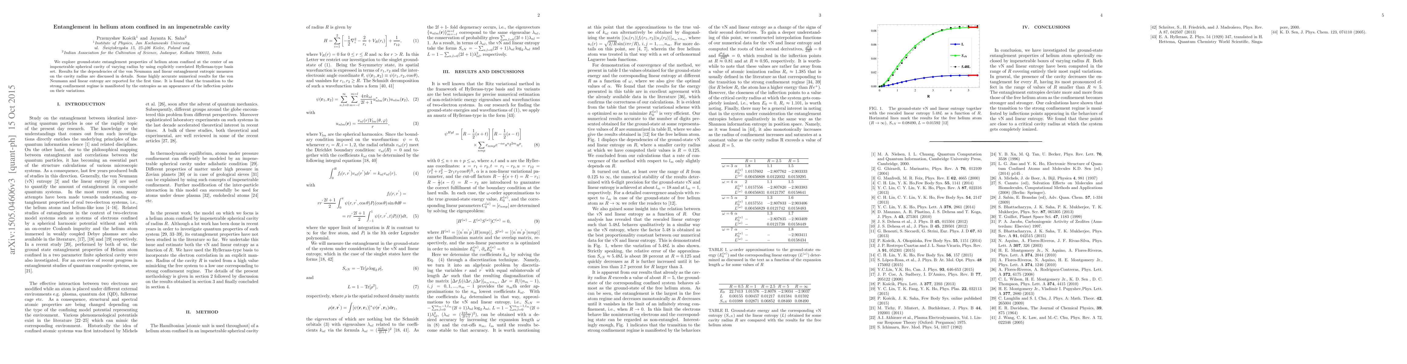 This study investigates the entanglement properties of helium atoms confined within an impenetrable spherical cavity, revealing how entanglement measures change with cavity size. Novel findings include the appearance of inflection points in entropy variations, indicating a transition to strong confinement.