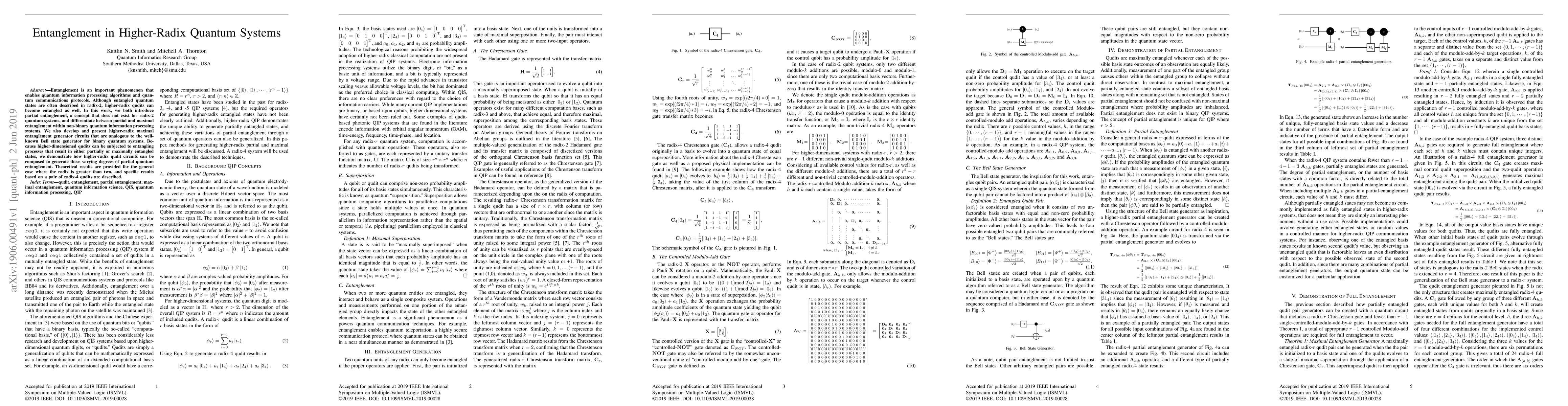 Entanglement is an important phenomenon that enables quantum information processing algorithms and quantum communications protocols. Although entangled quantum states are often described in radix-2, higher-radix qudits can become entangled as well. In this work, we both introduce partial entanglement, a concept that does not exist for radix-2 quantum systems, and differentiate between partial and maximal entanglement within non-binary quantum information processing systems. We also develop and present higher-radix maximal entanglement generator circuits that are analogous to the well-known Bell state generator for binary quantum systems. Because higher-dimensioned qudits can be subjected to entangling processes that result in either partially or maximally entangled states, we demonstrate how higher-radix qudit circuits can be composed to generate these varying degrees of partial quantum entanglement. Theoretical results are provided for the general case where the radix is greater than two, and specific results based on a pair of radix-4 qudits are described.
